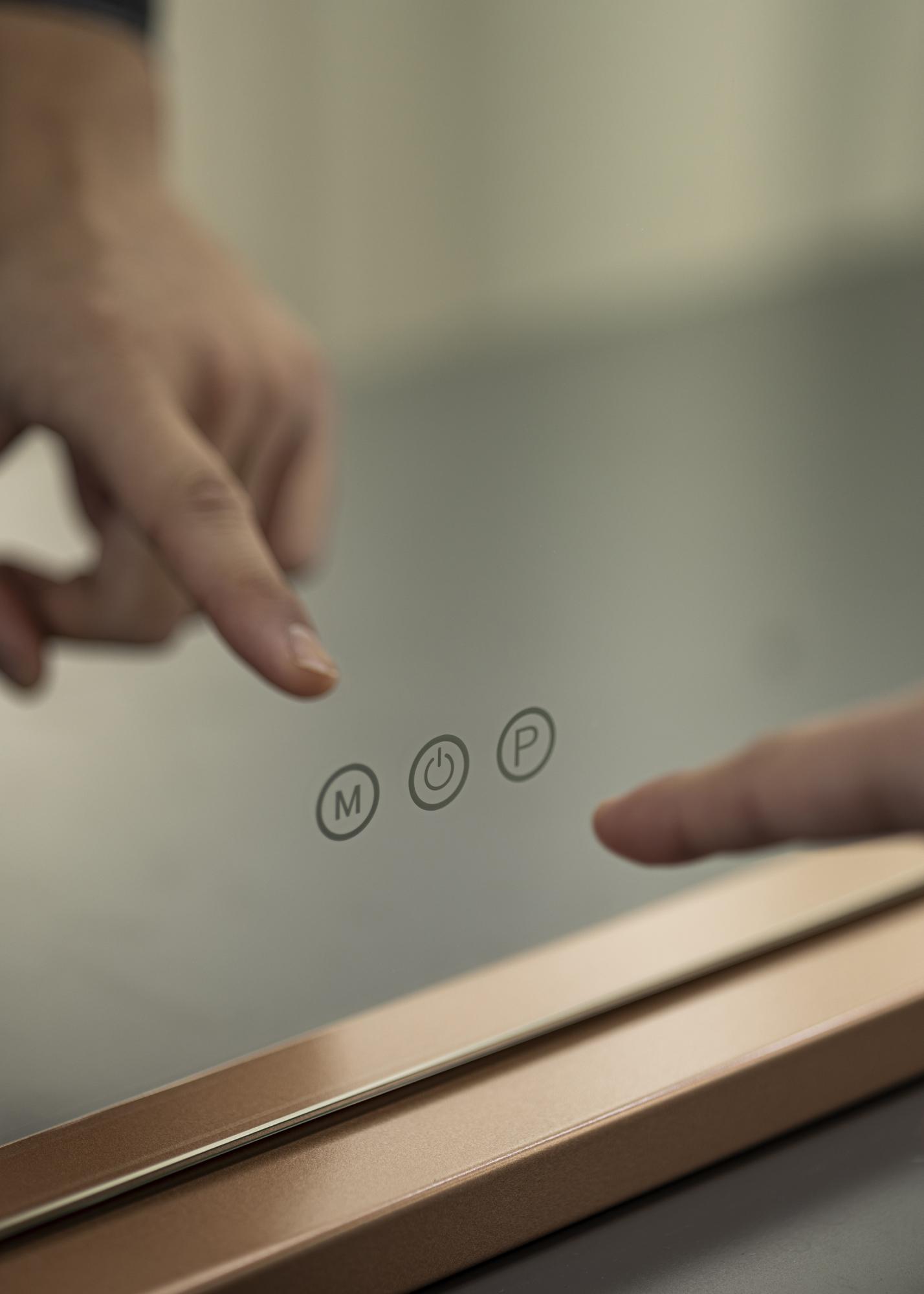 La surface réfléchissante du miroir mesure 58x46 cm et sur le bord inférieur de la surface miroir se trouvent trois boutons tactiles. Un pour allumer et éteindre l'éclairage et deux autres pour régler la luminosité. Si vous maintenez le bouton "M" enfoncé, vous pouvez régler la température de couleur de la lumière, et avec le bouton "P", vous pouvez facilement atténuer l'éclairage à la luminosité souhaitée. Le raccordement électrique s'effectue via une prise.