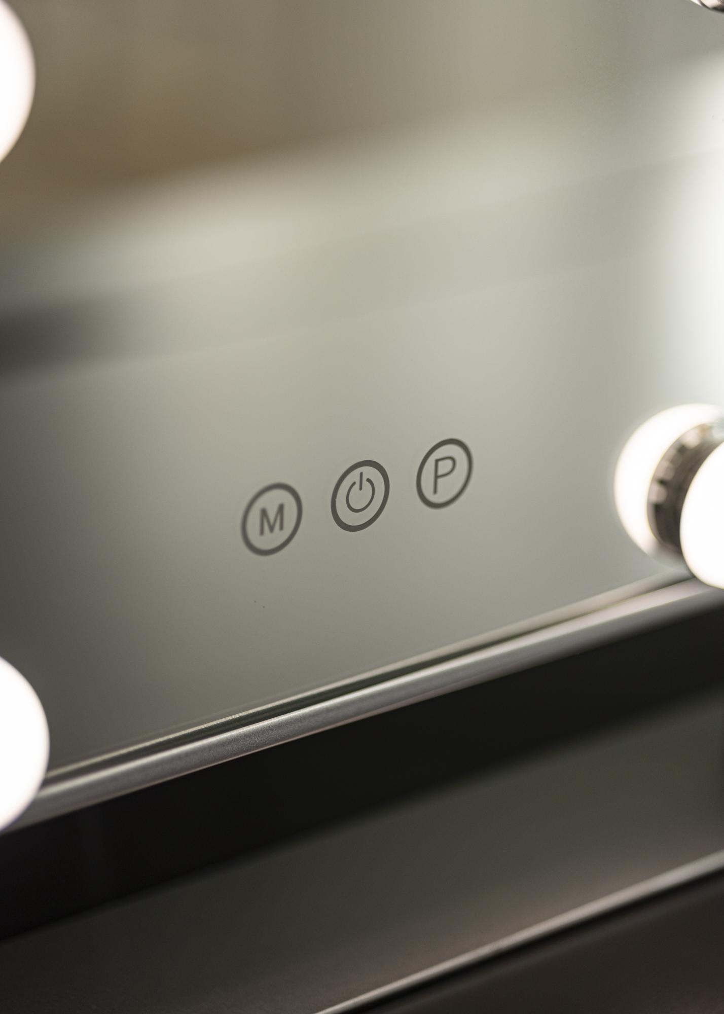 Ce miroir à maquillage par KAILA ajoutera du style et du glamour à votre intérieur ! Sa belle taille lui permet de s'intégrer tout aussi bien dans la chambre que dans le salon, selon le lieu que vous préférez pour vous maquiller et vous préparer avant de débuter la journée. Le miroir est dans une jolie couleur argent et est doté de 6 ampoules LED encadrant avec goût la surface réfléchissante du miroir. Le miroir disposent de boutons tactiles, grâce auxquels vous allumez et ajustez l'éclairage. Le bouton annoté d'un "M" permet de régler la température de couleur et le bouton annoté d'un "P" permet de régler la luminosité.