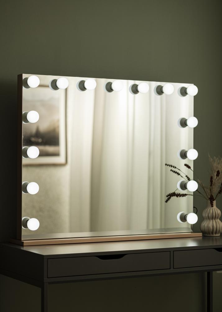 Ce miroir à maquillage a un éclairage intégré qui se présente sous la forme de 15 ampoules avec un culot E27, distribuant une lumière blanche froide. L'éclairage peut être atténué à l'aide d'un bouton de gradateur situé sur un côté du miroir. Le miroir se branche avec une prise.