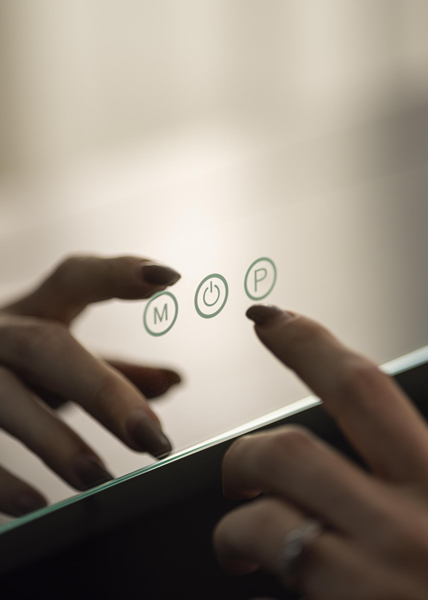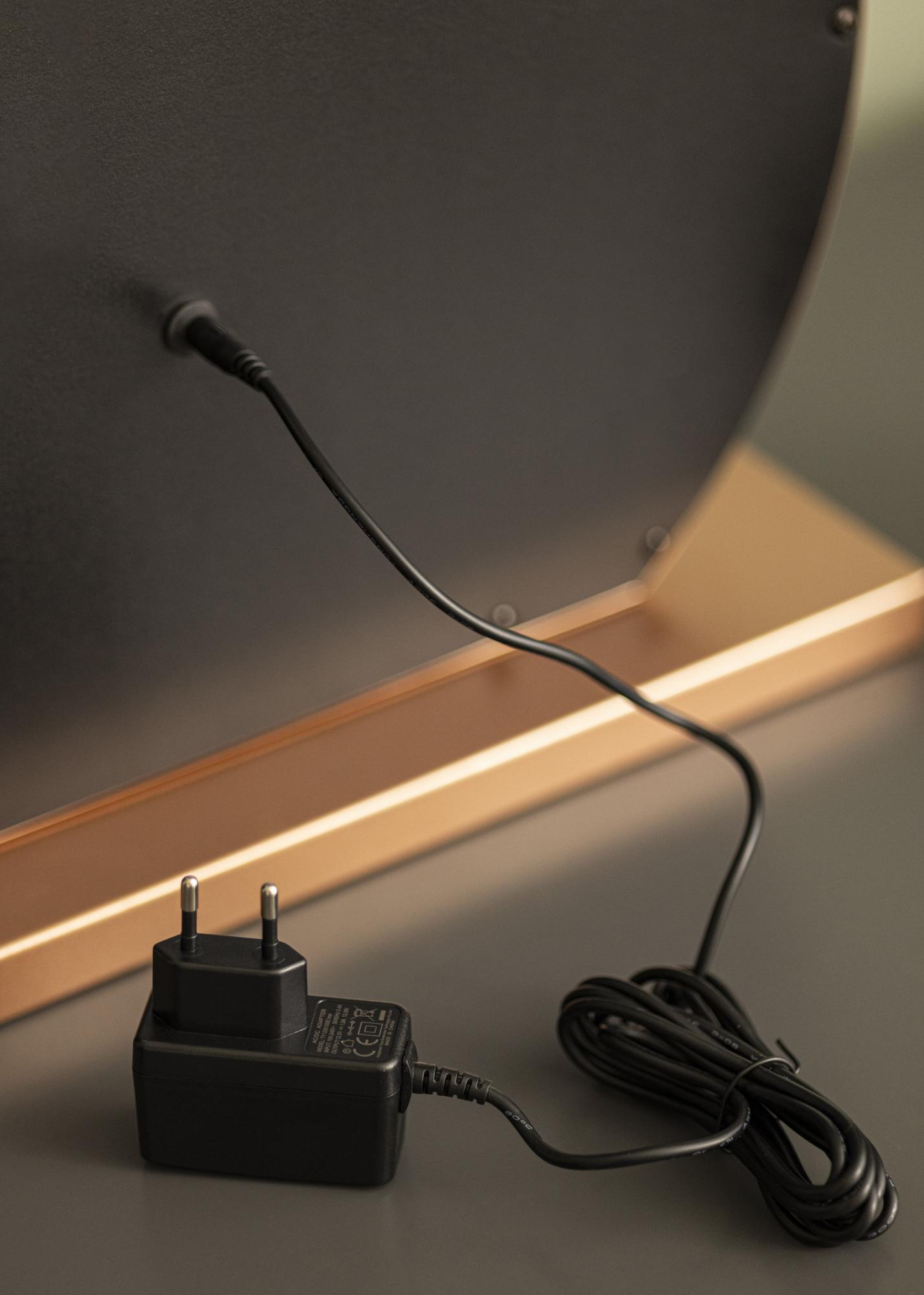 Ce miroir a une forme ronde classique avec 10 grandes ampoules LED qui encadrent la grande surface réfléchissante de 40x30 cm. Cela lui donne un aspect exclusif, qui est encore renforcé par le socle du miroir dans une teinte tendance rose dorée. Vous allumez l'éclairage intégré via un bouton tactile sur le devant du miroir. Vous avez également la possibilité de régler la température de couleur et la luminosité de la lumière selon vos souhaits. Cela se fait également à l'aide de boutons tactiles, l'un est marqué d'un "M" pour régler la température de couleur et l'autre d'un "P" pour régler la luminosité. Les trois températures de lumière que vous pouvez choisir sont la lumière chaude, froide et naturelle.