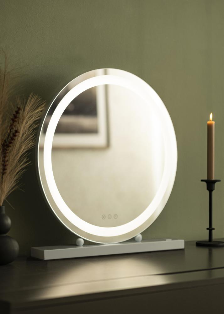 Vous désirez un miroir sophistiqué conçu pour être posé sur la coiffeuse, la commode, à mettre dans le hall d'entrée ou bien sur le buffet du salon ? Voici un miroir rond doté d'un socle épuré blanc et d'un éclairage LED intégré, qui sont à la fois des éléments élégants et pratiques pour votre maison. L'éclairage LED du miroir à maquillage se compose d'un ruban LED intégré qui s'allume et s'éteint via un bouton tactile sur la surface du miroir. Il y a aussi des boutons tactiles pour régler l'éclairage du miroir ; un bouton marqué d'un "M" pour le réglage de la température de couleur et un bouton marqué d'un "P" pour la puissance de la luminosité.