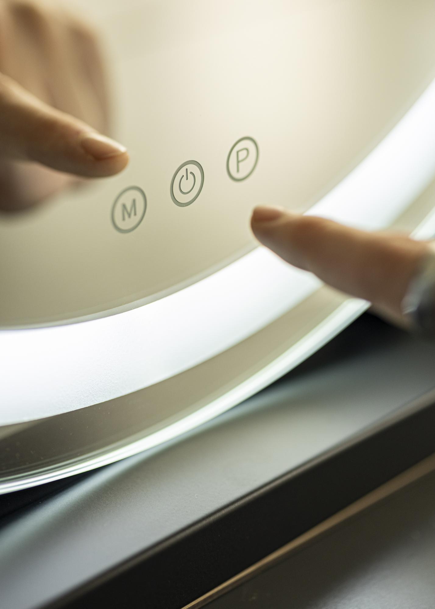 Voici un miroir à maquillage dans une format portrait, avec un socle dans un coloris noir neutre qui s'accordera facilement avec le reste de votre décoration d'intérieur. La surface du miroir a une forme ronde classique d'un diamètre de 50 cm qui est magnifiquement encadrée par un ruban LED intégré. Il y a trois boutons tactiles sur le bord inférieur de la surface du miroir - un bouton marche/arrêt qui allume et éteint l'éclairage, un bouton "M" qui ajuste la température de couleur de l'éclairage et un bouton "P" qui vous permet de diminuer la luminosité de l'éclairage à votre guise. Le miroir se branche à une prise.
