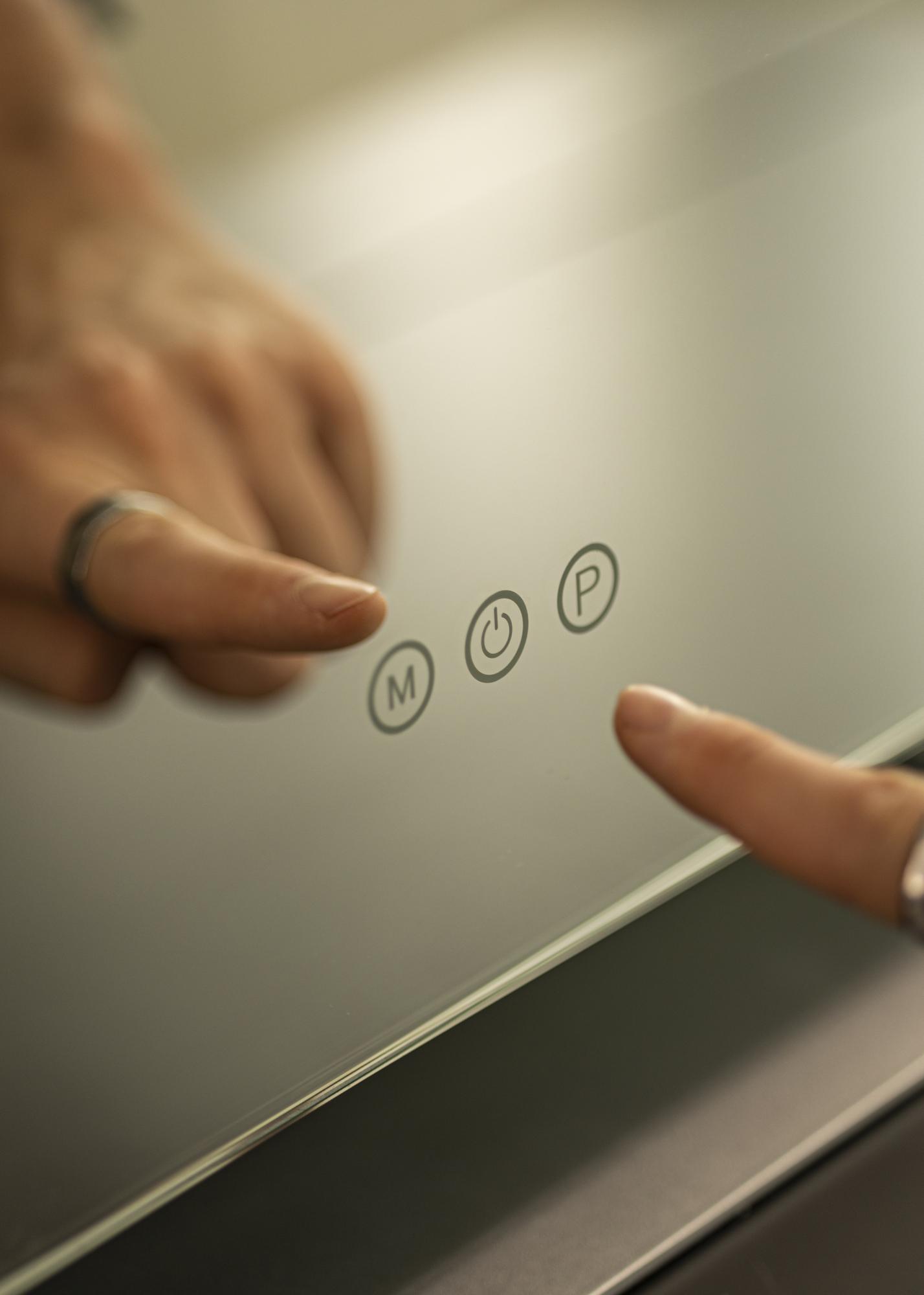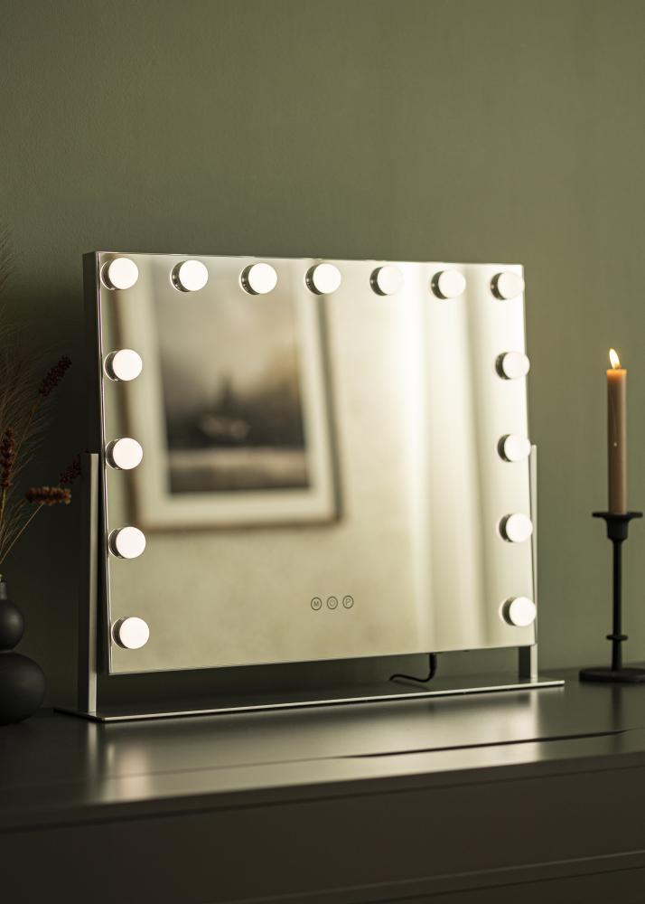 Grâce à un élégant miroir à maquillage, vous pouvez créer une atmosphère encore plus luxueuse, et ce dans n'importe quelle pièce. Ce miroir dispose d'un éclairage LED intégré que vous pouvez adapter selon si vous désirez obtenir un joli éclairage d'ambiance dans le salon, ou bien une lumière plus vive pour votre coin make-up. Afin d'ajuster l'éclairage, utilisez le bouton tactile situé sur le bord inférieur du miroir ; la touche "M" permet d'ajuster la température de couleur et la touche "P" de modifier la puissance lumineuse. Il y a aussi un bouton marche/arrêt pour allumer et éteindre l'éclairage du miroir. Le raccordement électrique se fait via une prise.