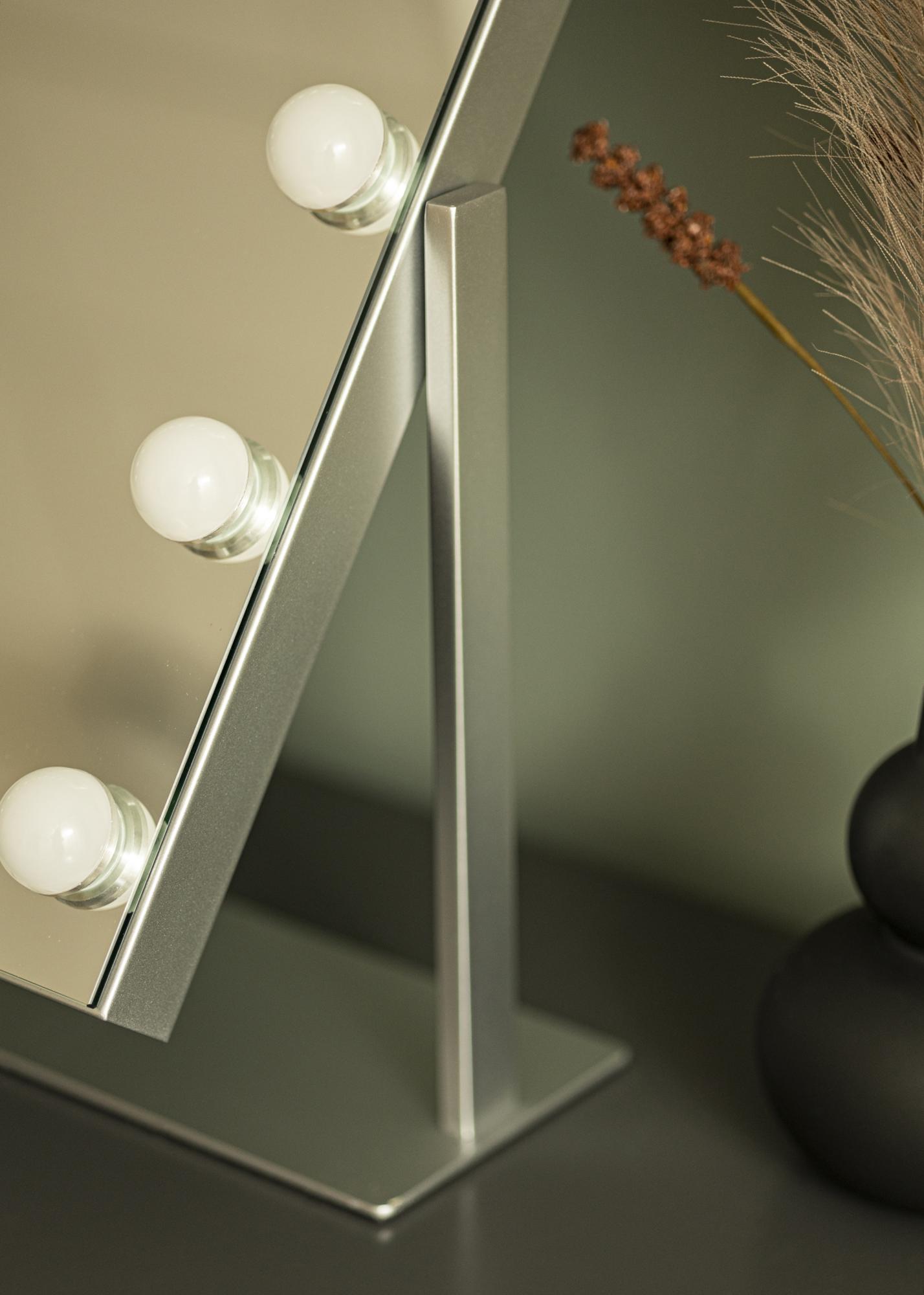 Ce miroir est doté d'un socle de couleur argentée qui donne à la fois un look élégant et permet aussi d'incliner la surface du miroir. Sur le bord inférieur du miroir se trouve une prise USB pour charger vos appareils intelligents.