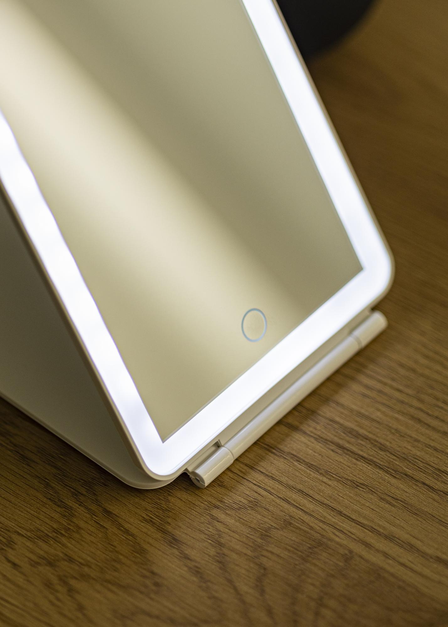 Voici un miroir blanc avec éclairage LED incrusté qui apporte une lueur agréable à votre visage. Il est alimenté par batterie et peut être facilement rechargé via une connexion USB lorsque la batterie commence à s'épuiser. Le miroir s'allume via un bouton tactile sur la surface du miroir, avec lequel vous pouvez également régler la luminosité. En maintenant le bouton enfoncé pendant quelques secondes, vous pouvez à la fois atténuer la lumière et régler températures de couleur différentes.