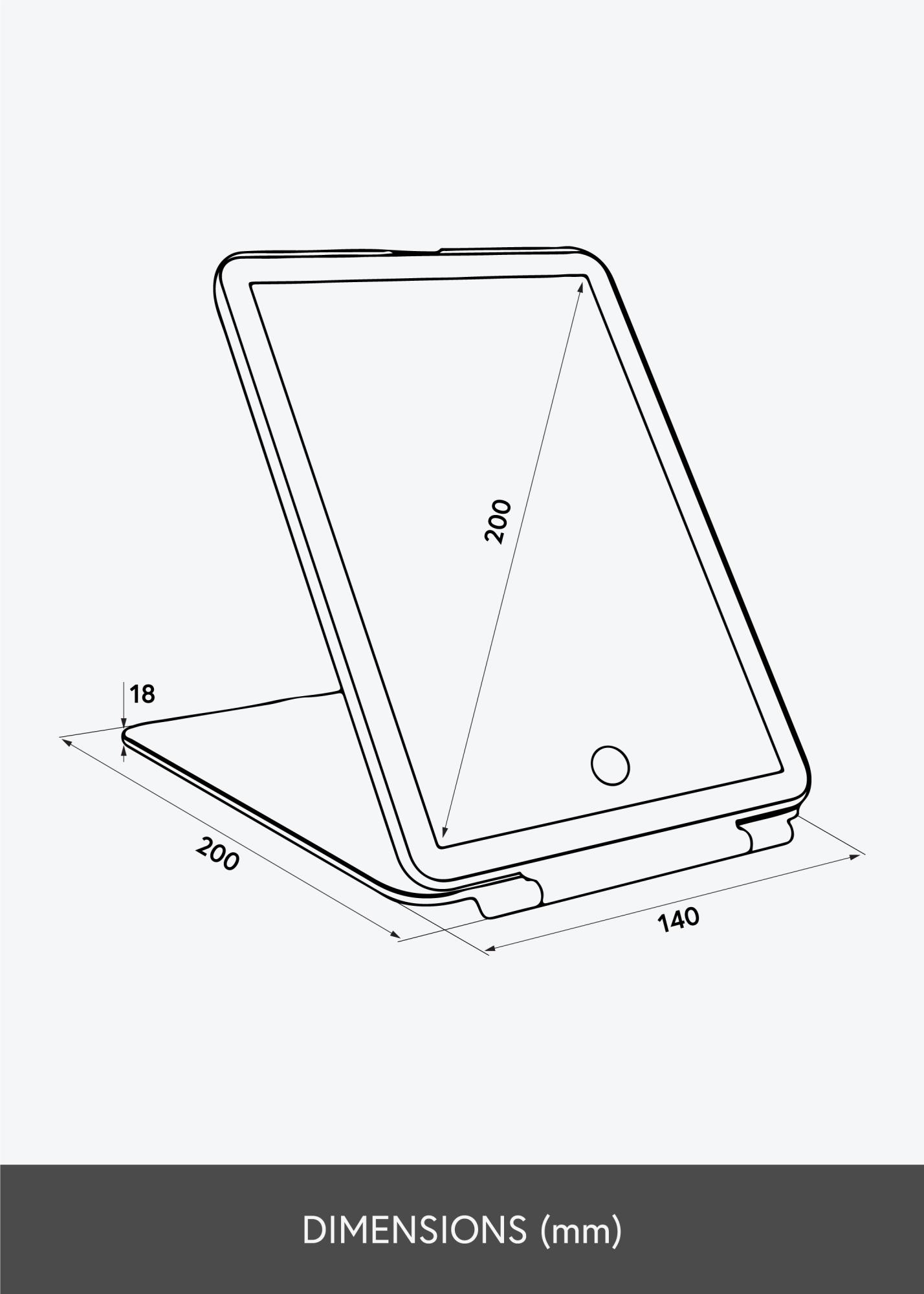 Ce miroir se présente dans une couleur noire élégante et il peut également être replié, ce qui permet à la fois de gagner de la place et de protéger la surface du miroir des rayures lorsque vous rangez le miroir dans votre sac. Lorsqu'il est ouvert, vous pouvez incliner le miroir. Sur sa surface réfléchissante se trouve un bouton tactile qui permet d'allumer et d’éteindre l'éclairage du miroir. Si vous maintenez le bouton enfoncé pendant quelques secondes, vous pouvez également modifier les paramètres d'éclairage.