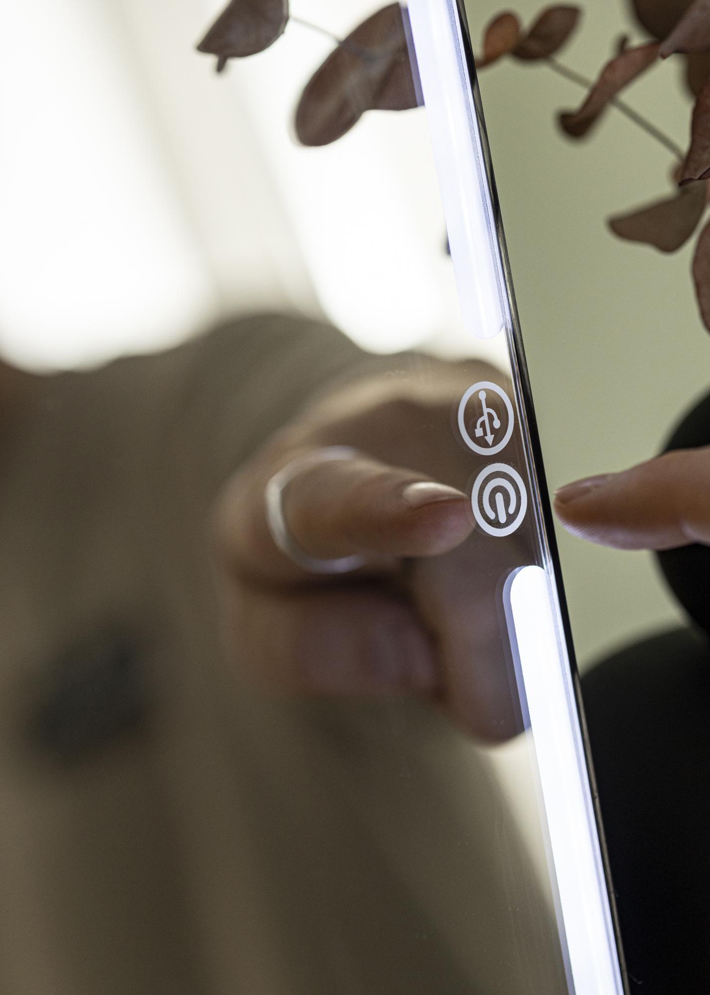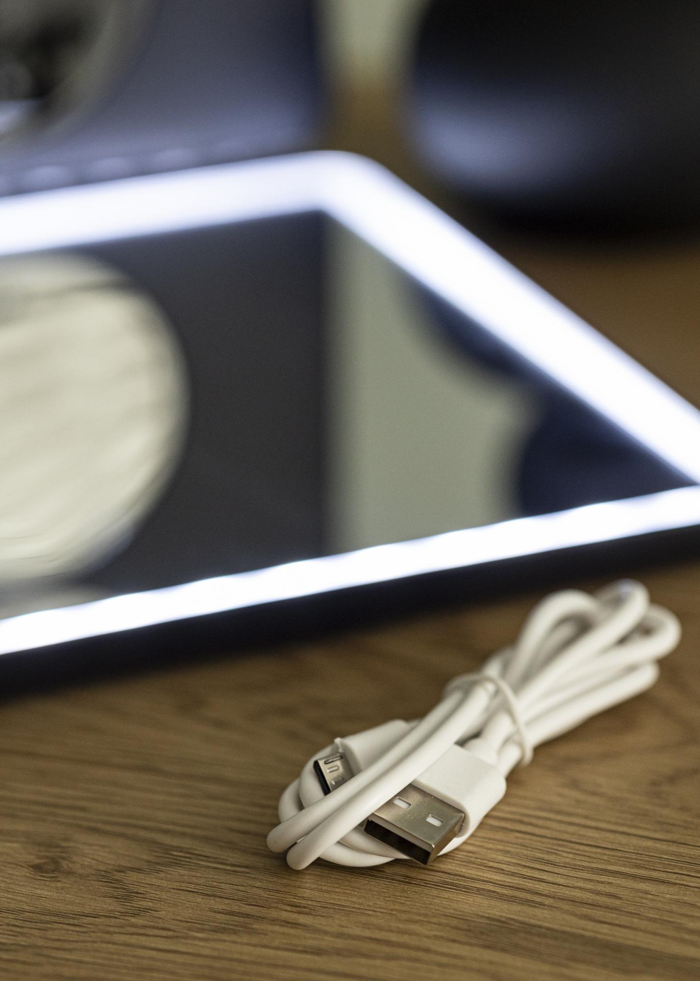 Ce miroir à maquillage est dans une couleur noire épurée et a un éclairage LED intégré. L'éclairage s'ajuste à l'aide de boutons tactiles sur le cadre du miroir, avec lesquels vous allumez également le miroir. Si vous fermez le miroir alors qu'il est allumé, il passe automatiquement en mode économie d'énergie, puis se rallume la prochaine fois que vous rouvrez le miroir. Le miroir fonctionne sur batterie et se recharge via une connexion USB.
