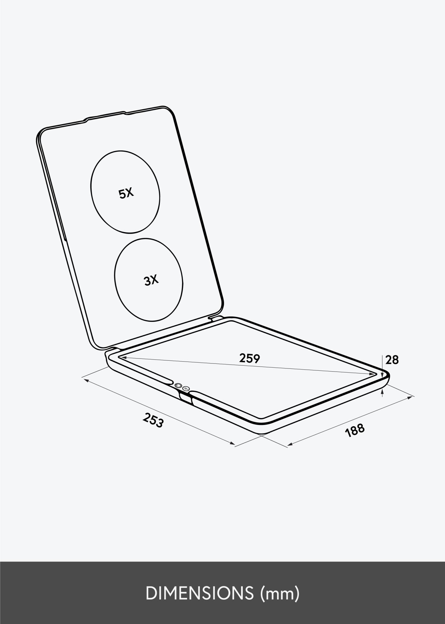 Vous désirez un miroir à maquillage compact qui puisse se glisser dans le sac ? Alors ce miroir compact est un excellent choix ! Le miroir a une surface réfléchissante de 18,5x25 cm et sa conception permet de le refermer afin de protéger le miroir de la saleté. Le fait qu'il puisse se refermer vous permet également d'incliner le miroir lors de son utilisation. En plus de son verre miroir ordinaire, le miroir vous offre une surface réfléchissante avec un zoom x3 et une autre avec un zoom x5.