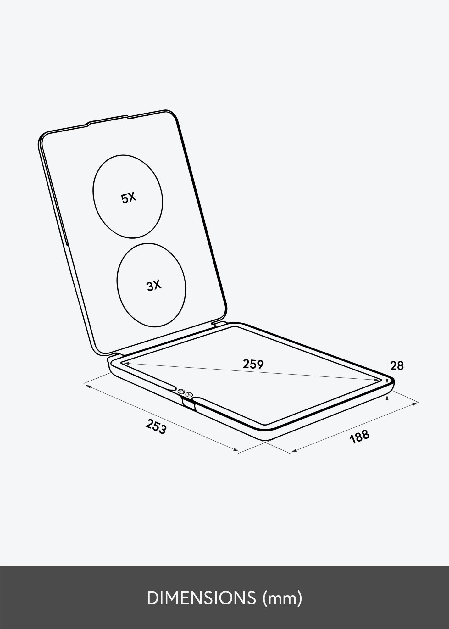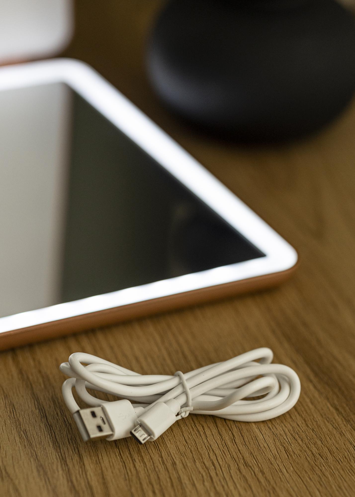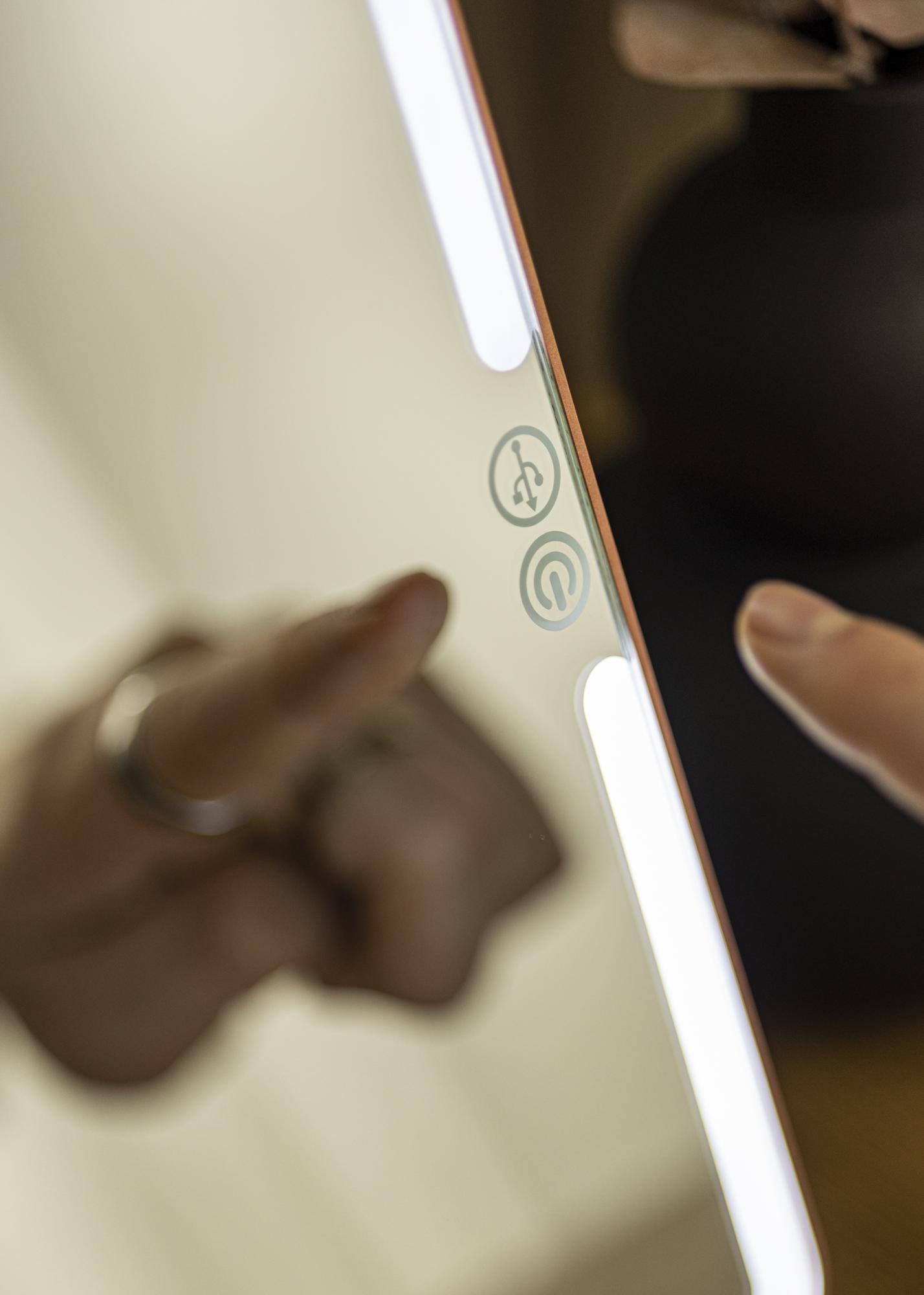 Son ruban LED intégré fournit une lumière agréable lorsque vous vous reflétez. L'éclairage est alimenté par une batterie intégrée qui se recharge facilement via une connexion USB. Le miroir est équipé de boutons tactiles qui permettent d'allumer et d'éteindre l'éclairage et de régler la température de couleur de la lumière. Si vous repliez le miroir lorsqu'il est allumé, il passe automatiquement en mode d'économie d'énergie et la lumière s'éteint jusqu'à ce que vous ouvriez à nouveau le miroir.