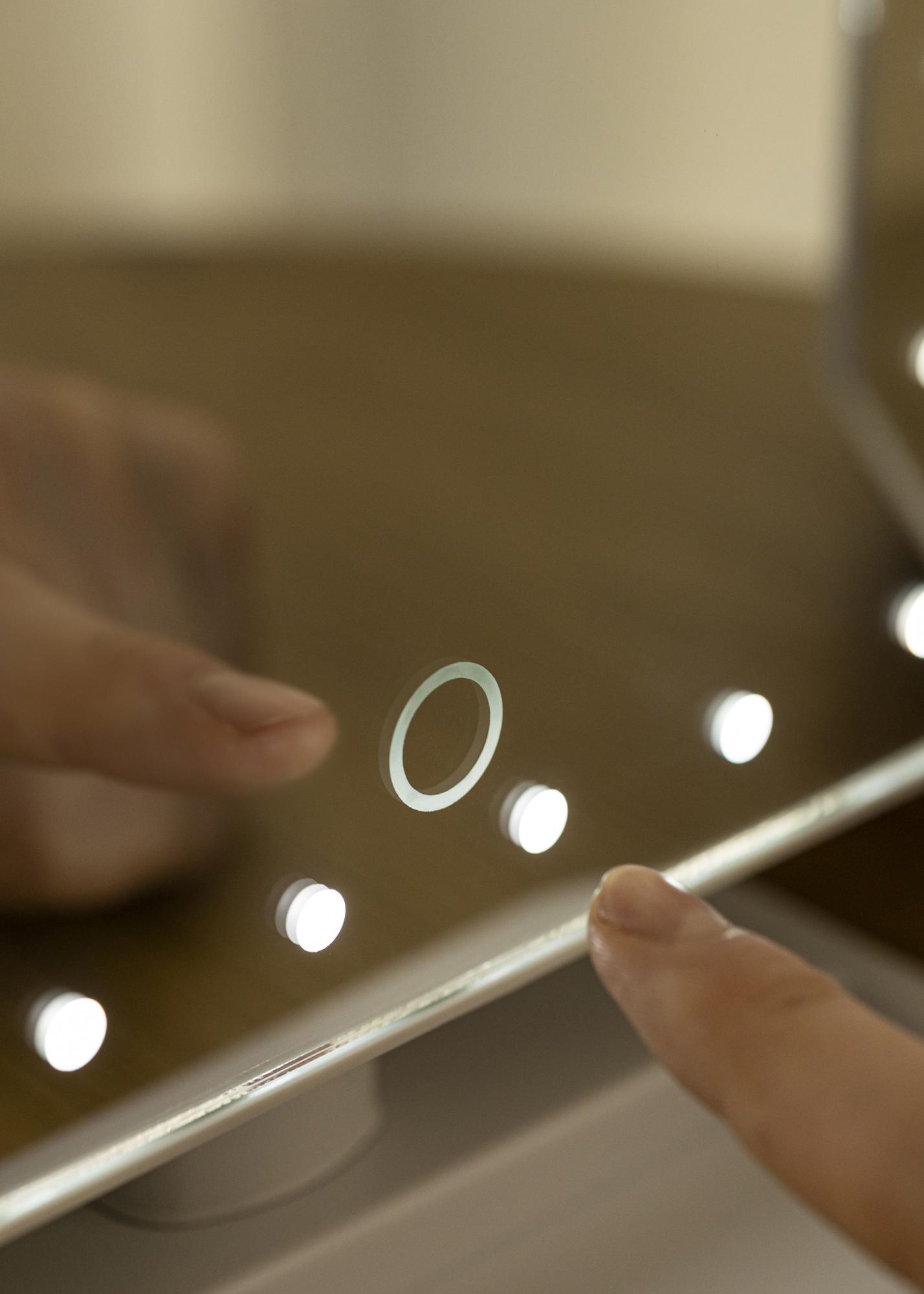 Vous pouvez facilement régler l'éclairage LED du miroir à l'aide du bouton tactile situé sur le bord inférieur du miroir. Si vous maintenez le bouton enfoncé pendant quelques secondes, vous pouvez ajuster l'éclairage à la puissance lumineuse souhaitée. Le miroir est alimenté par des piles AA, qui ne sont pas incluses et doivent être achetées séparément. Il peut également être connecté à un port USB. Le câble USB est inclus.