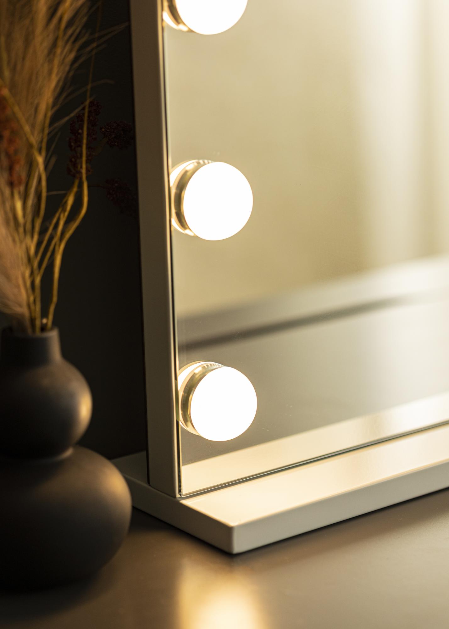 Laissez ce miroir de maquillage devenir un élégant détail d'intérieur dans votre maison ! L'éclairage LED intégré, avec 15 grosses ampoules LED placées tel un cadre autour de la surface du miroir de 80x60 cm, donne au miroir une apparence très distinguée qui apporte une touche de glamour dans chaque pièce. L'éclairage LED peut être adapté à vos besoins, car vous pouvez régler à la fois la luminosité et la température de couleur. Les paramètres d'éclairage s'ajustent facilement via les boutons tactiles situés sur la surface du miroir - le bouton "P" règle la luminosité et le bouton "M" règle la température de couleur. Les trois réglages de température de couleur possibles sont lumière chaude, froide et naturelle. Le raccordement électrique se fait via une prise.