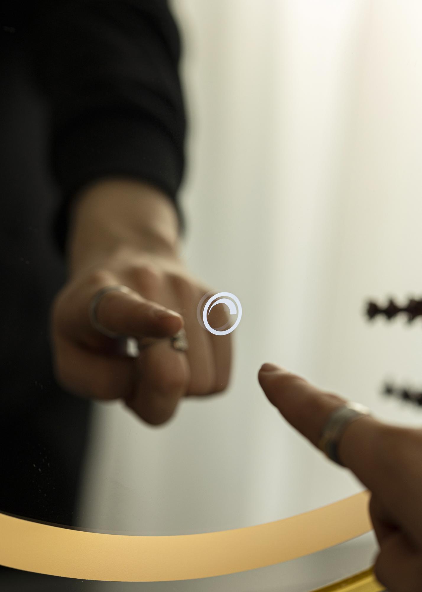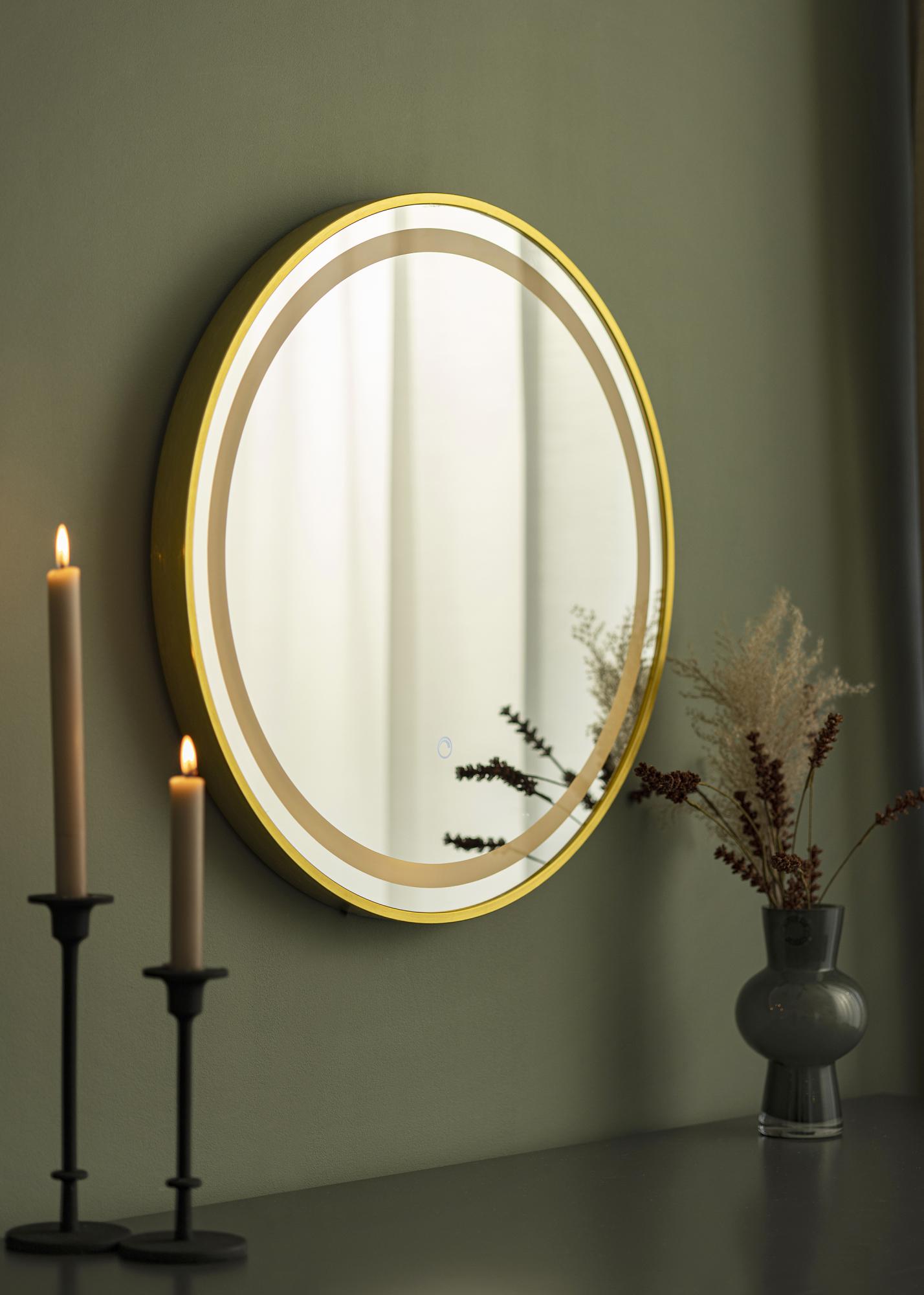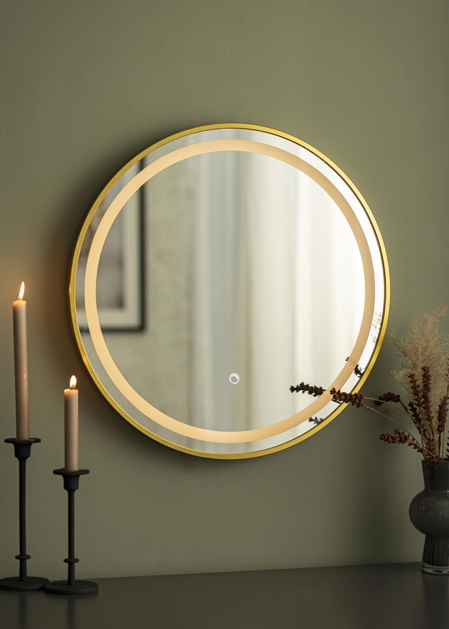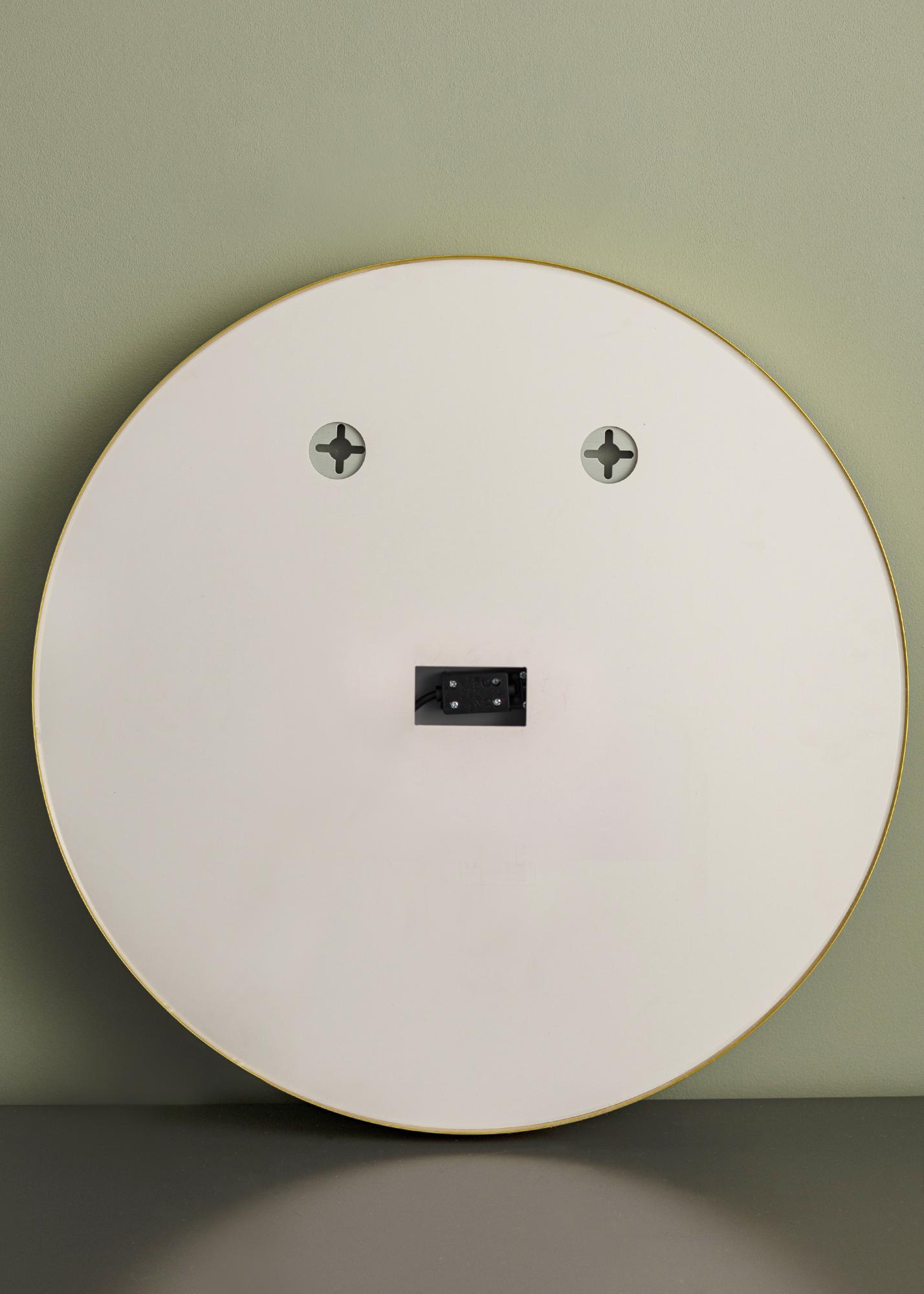 Voici un miroir de salle de bain rond avec un éclairage LED et un élégant cadre de couleur laiton. Le miroir mesure 60 cm de diamètre. L'éclairage LED intégré au verre du miroir rond apporte une lueur chaude et blanche en 3000K. L'éclairage peut s'atténuer et vous ajustez facilement la puissance en maintenant le bouchon tactile de l'écran enfoncé pendant plusieurs secondes. Le miroir est doté d'une fonction qui mémorise votre dernier réglage de la luminosité la prochaine fois que vous activez l'éclairage. La LED est une source de lumière écoénergétique qui fournit une lumière uniforme et naturelle. Le miroir de salle de bain est destiné à une installation fixe et il se connecte à un interrupteur. Afin que le miroir puisse fonctionner correctement, celui-ci doit être connecté à un interrupteur normal et non à un gradateur de lumière.