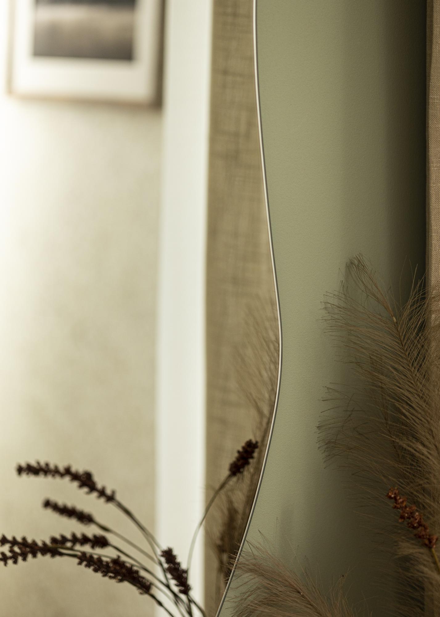 Voici un miroir mural dans un design tendance, avec des côtés dans une forme ondulée douce. Le bord inférieur est droit, ce miroir sera donc très élégant lorsque suspendu au-dessus d'un meuble, avec son bord inférieur créant une parallèle avec la surface de la commode ou de la table d'appoint. Le miroir est doté de supports muraux situés au dos et s'accroche au mur à la verticale.