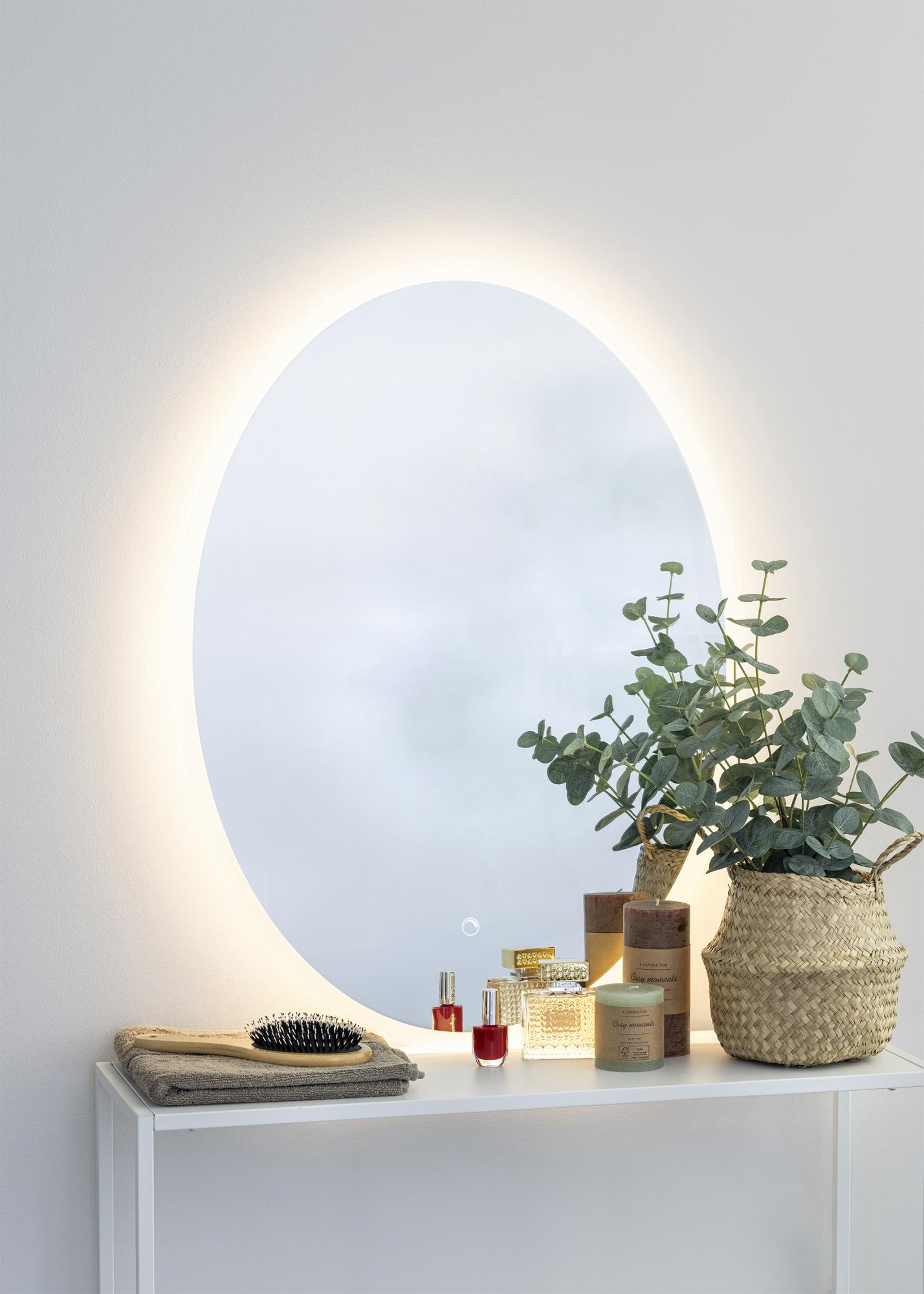 Voici un véritable miroir de salle de bain au design élégant avec sa forme ovale et son éclairage LED intégré ! L'éclairage LED intégré peut s'atténuer et la puissance s'ajuste facilement en appuyant sur le bouton tactile étanche disposé sur l'écran. L'éclairage projette une lumière dans une teinte blanche chaude en 3000K par l'arrière du miroir et projette une jolie lueur sur l'avant. La LED est une source de lumière écoénergétique qui fournit une lumière uniforme et naturelle. Le miroir est adapté pour les salles de bain. Le miroir de salle de bain est destiné à une installation fixe et se connecte à un interrupteur. Afin que le miroir puisse fonctionner correctement, celui-ci doit être connecté à un interrupteur normal et non à un gradateur de lumière.