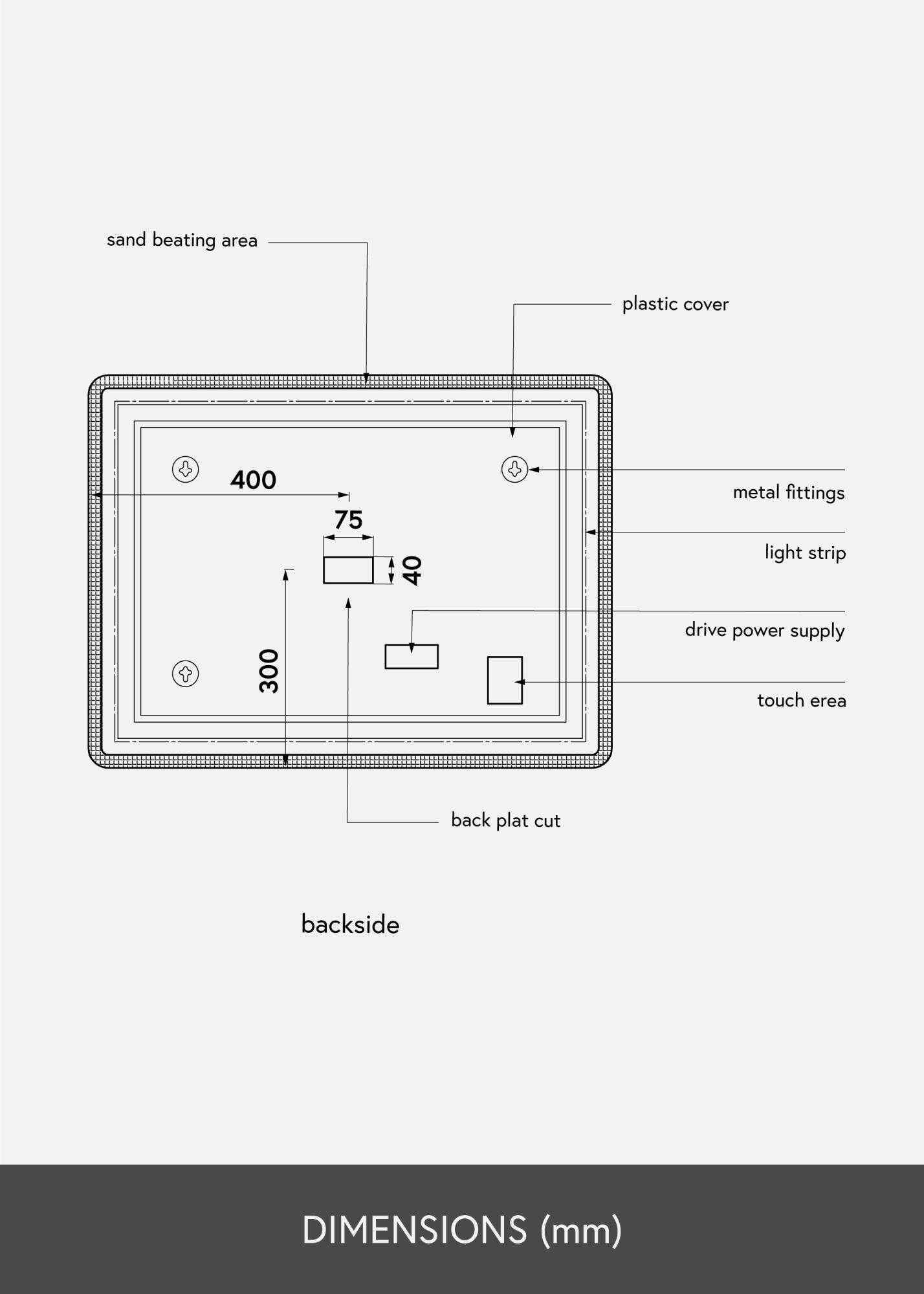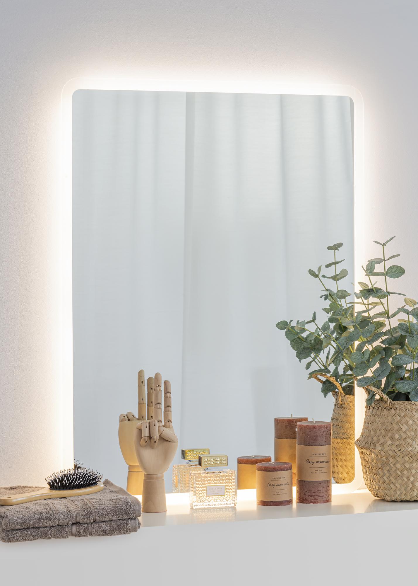 Ce miroir de salle de bain au design intemporel a une forme rectangulaire et des bords doux avec des coins arrondis. Le long de ses bords, un éclairage LED intégré encadre joliment le miroir. L'éclairage LED éclaire par l'arrière du miroir et projette une jolie lueur vers l'avant en 3000K dans une nuance blanche chaude. L'éclairage peut s'atténuer et vous ajustez facilement la puissance en maintenant le bouchon tactile de l'écran enfoncé pendant plusieurs secondes. Le miroir se souvient du dernier réglage de la luminosité lorsque vous activez à nouveau l'éclairage. Le miroir est adapté pour les salles de bain. Ce miroir de salle de bain est destiné à une installation fixe et il se connecte à un interrupteur. Afin que le miroir puisse fonctionner correctement, celui-ci doit être connecté à un interrupteur normal et non à un gradateur de lumière.
