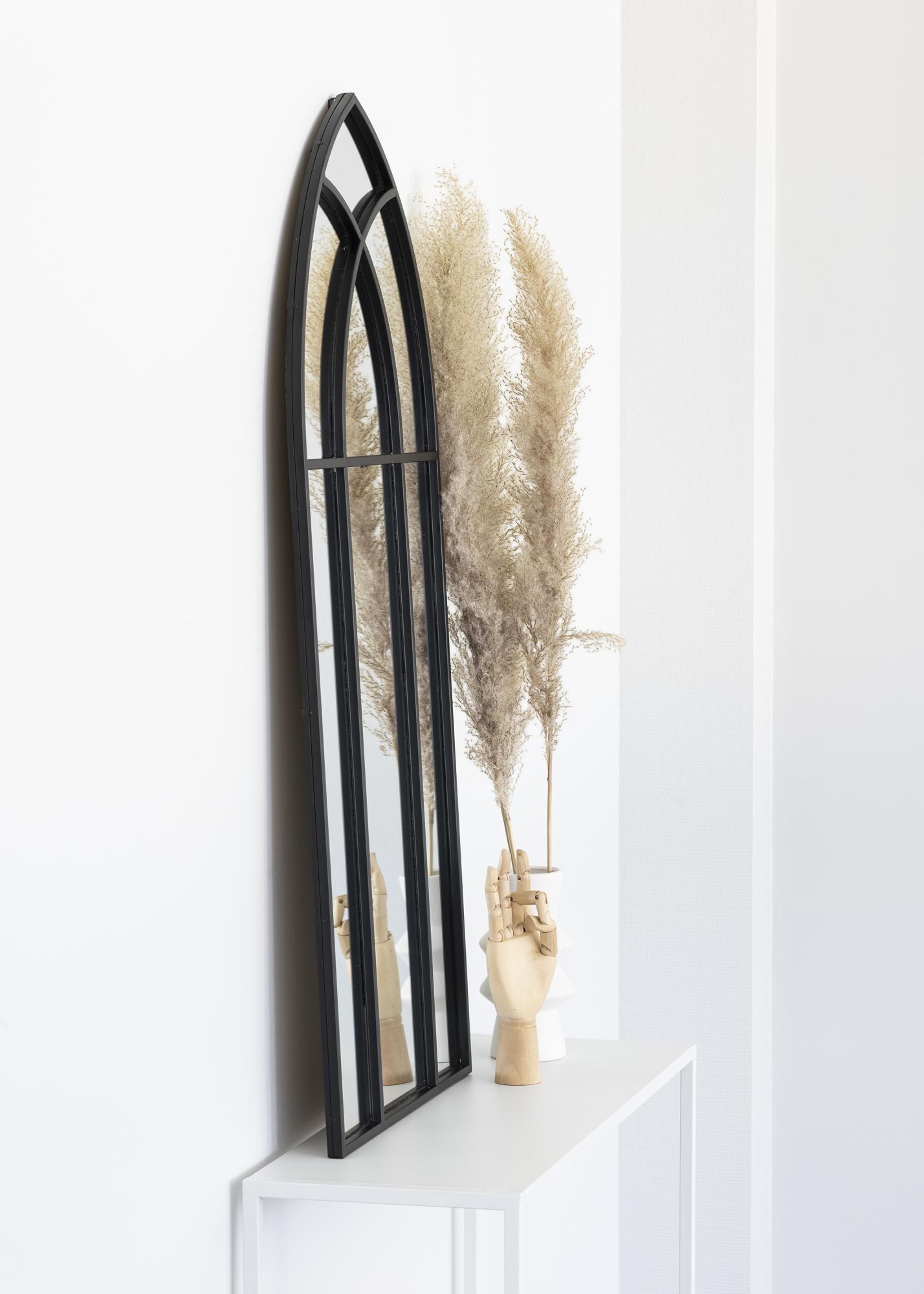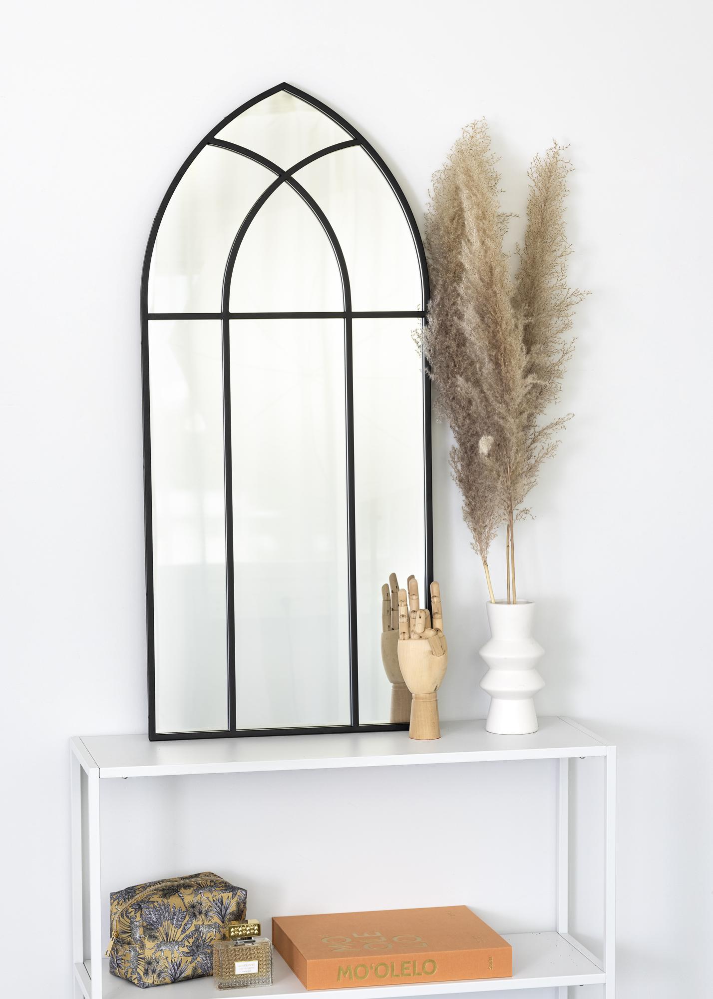 C'est un miroir très décoratif qui créé immédiatement une ambiance plus romantique dans la pièce où il est positionné ! La conception du miroir rappelle une fenêtre de jardin et se dote en même temps d'un caractère un peu gothique. La forme attrayante de ce miroir en fera un détail captivant dans votre maison ! Le miroir mesure 45x100 et il a un motif décoratif composé de fines lignes noires en métal.