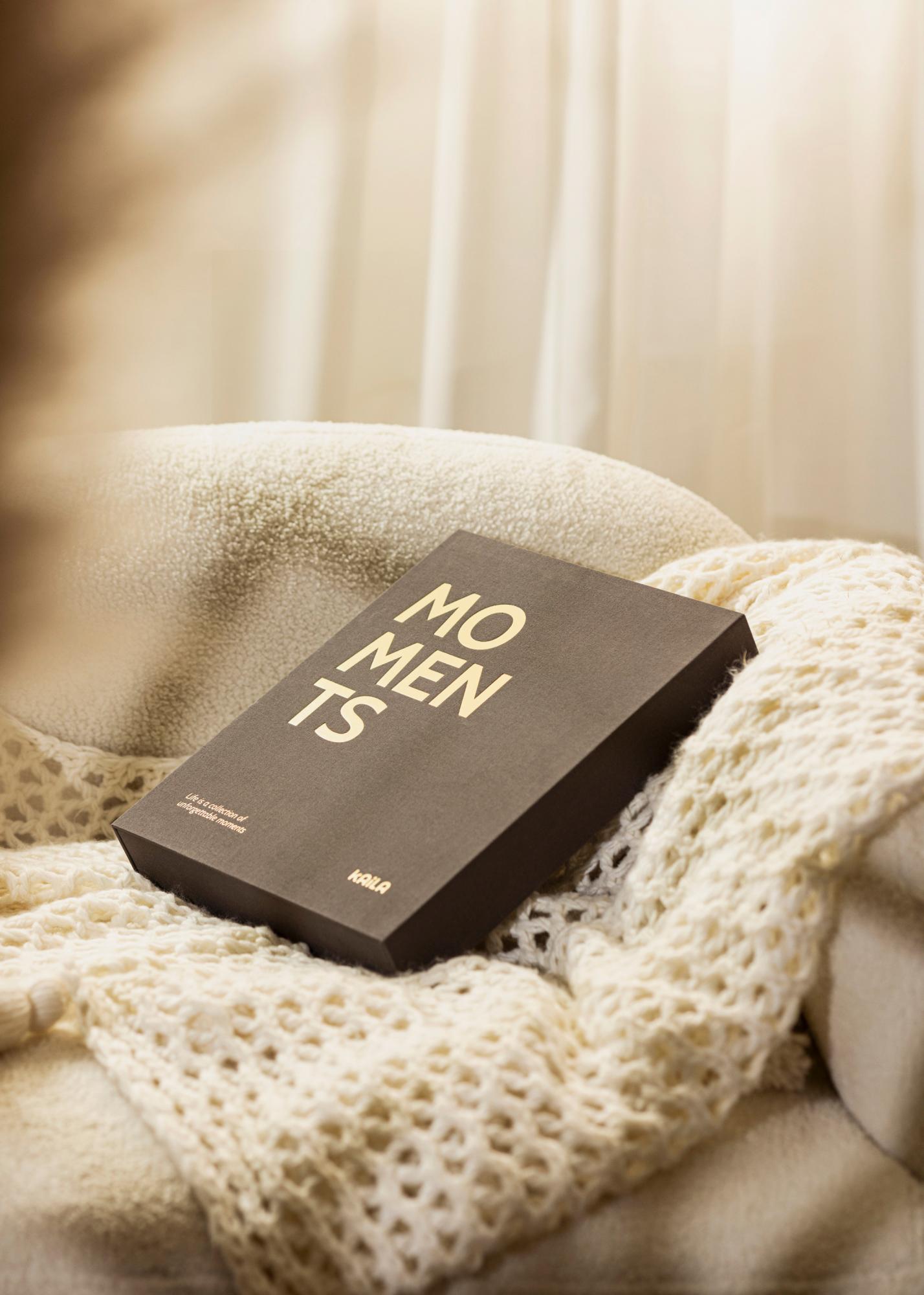 L'album photo est conçu sous la forme d'une boîte à ouvrir tel un livre pour regarder vos images. La couverture est décorée avec du tissu noir, ce qui apporte une sensation luxueuse. Sur la couverture et sur la tranche est inscrit le texte ”MOMENTS”. Sur le coin gauche de la couverture nous pouvons lire un joli sous-texte ”Life is a collection of unforgettable moments”.