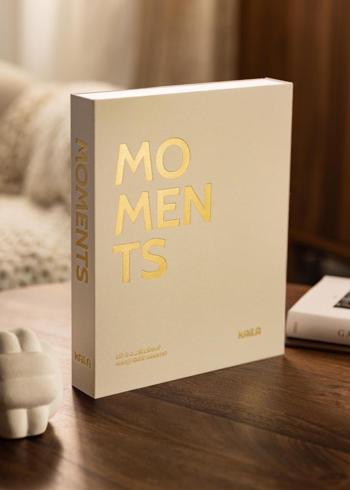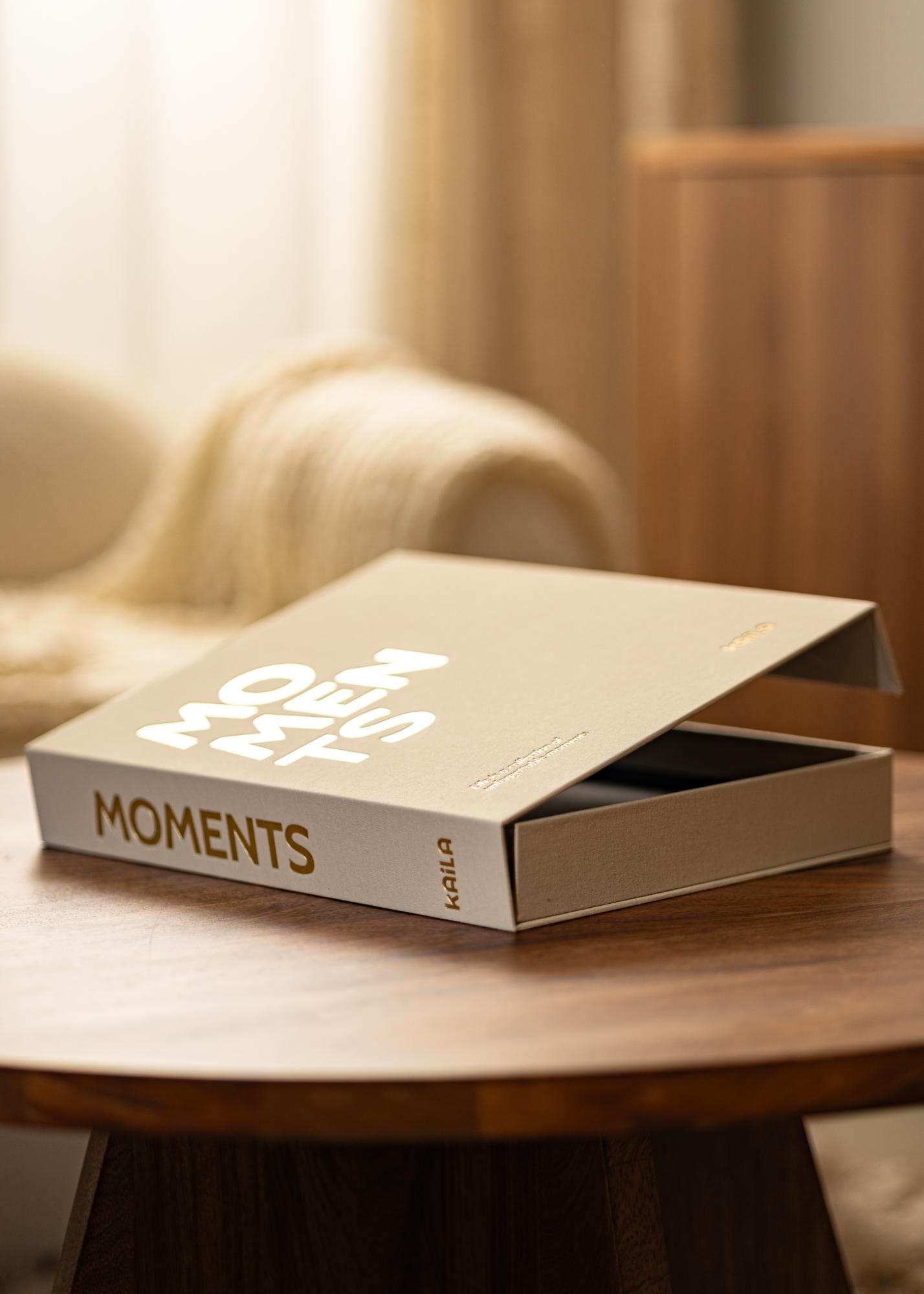 L'album photo est conçu sous la forme d'une boîte à ouvrir tel un livre pour regarder vos images. La couverture est décorée avec du tissu couleur crème, ce qui apporte une sensation luxueuse. Sur la couverture et sur la tranche est inscrit le texte ”MOMENTS”. Sur le coin gauche de la couverture nous pouvons lire un joli sous-texte ”Life is a collection of unforgettable moments”.