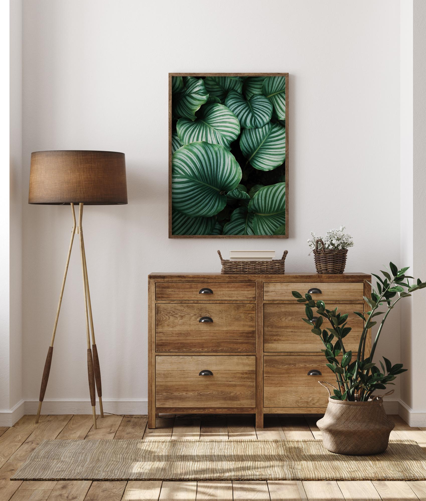 Une magnifique affiche avec vue aérienne sur des feuilles de Calathea vert foncé. La lumière du soleil se reflète sur les feuilles, créant une lumière intense. Les différentes nuances de vert forment un décor intense, ce qui en fait un tirage idéal à accrocher dans un salon bien fourni en plantes.