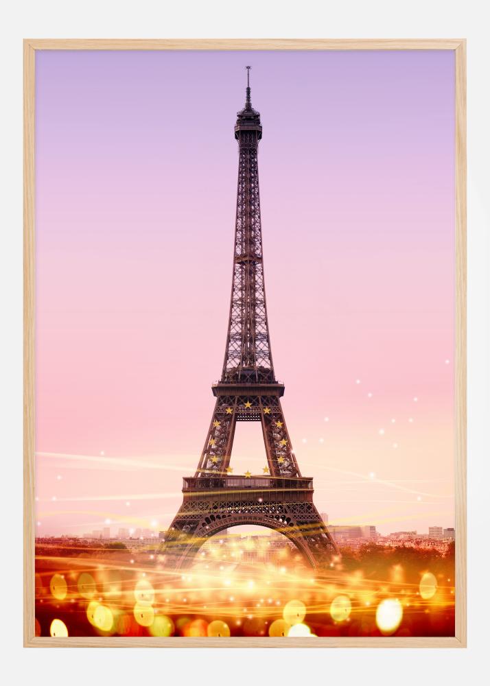 Cette affiche capture la majestueuse Tour Eiffel dans un crépuscule atmosphérique. Les douces teintes pastel du ciel créent un fond romantique pour ce monument emblématique, tandis que les lumières de la ville en dessous scintillent comme des étoiles, ajoutant une sensation de magie et de rêve. C'est un hommage à Paris, la ville des lumières, et à sa capacité à inspirer l'amour et l'émerveillement.