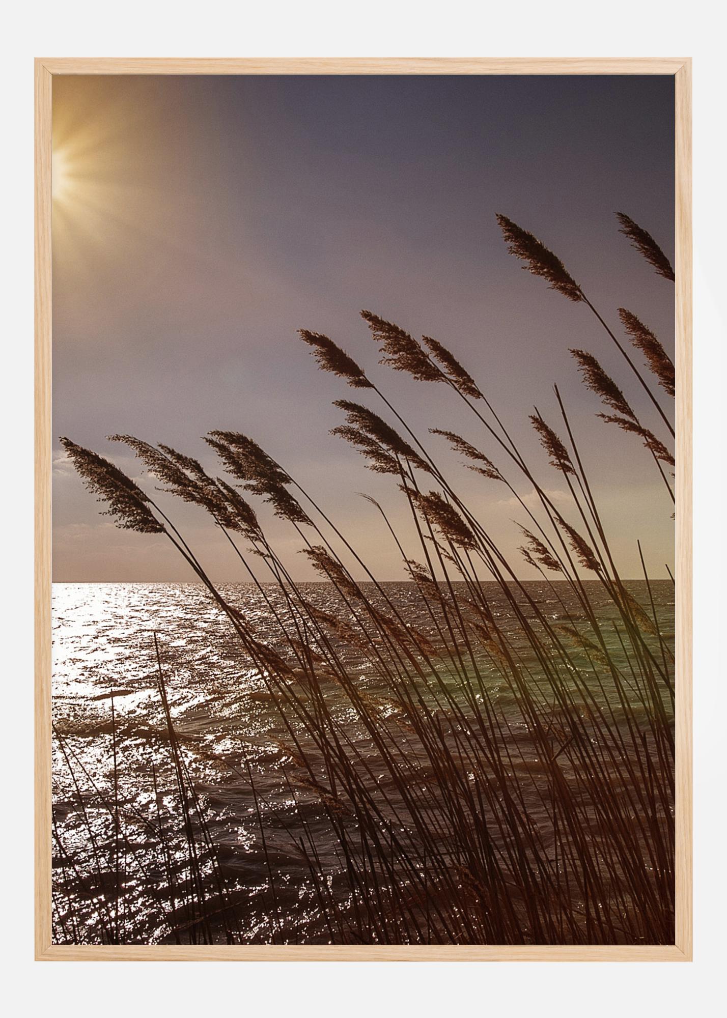 Une belle affiche de coucher de soleil au bord de l'eau. Avec le soleil qui brille sur l'eau, les herbes séchées volent doucement dans le vent. Les doux tons orangés donnent un sentiment de paix et de tranquillité. Un must pour n'importe quelle pièce de la maison.