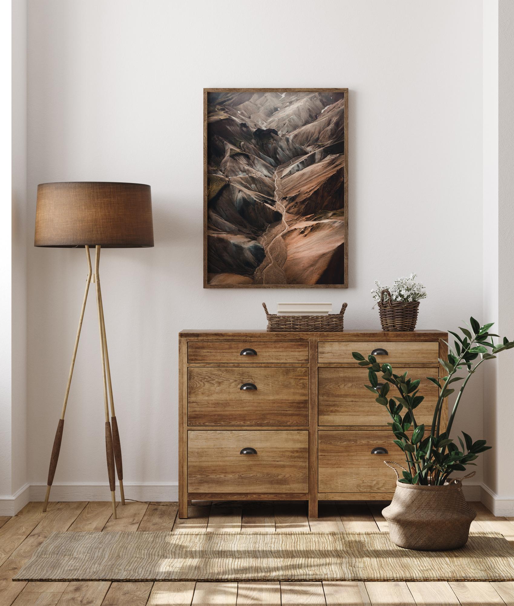 Une affiche aérienne spectaculaire représentant les montagnes colorées de Ryholite. Les douces couleurs d'automne et les tons bruns créent un sentiment de chaleur, ce qui en fait une image inspirante à accrocher dans votre maison. Suivez le chemin unique et voyez où vous mène ce magnifique sentier naturel.