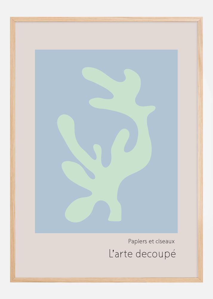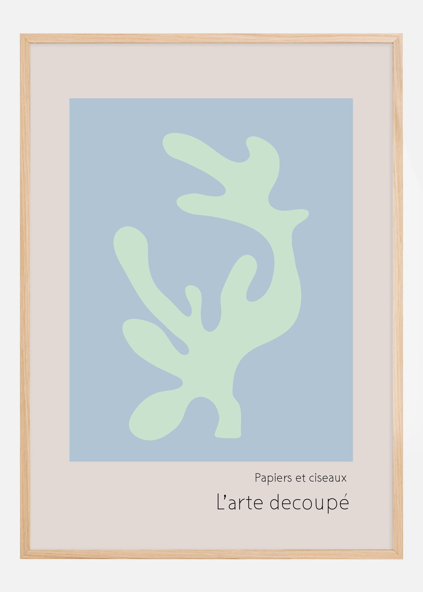 Ce poster sophistiqué et minimaliste rend hommage à 'L'arte découpé', l'art de découper le papier, qui est une forme d'expression artistique élégante et intemporelle. Il représente une forme abstraite dans une nuance de vert pastel apaisante flottant sur un fond bleu doux, offrant une illusion de légèreté et de fugacité. La forme simple, qui est à la fois organique et ouverte à l'interprétation, invite le spectateur à explorer les espaces négatifs et à trouver sa propre signification dans le motif découpé.