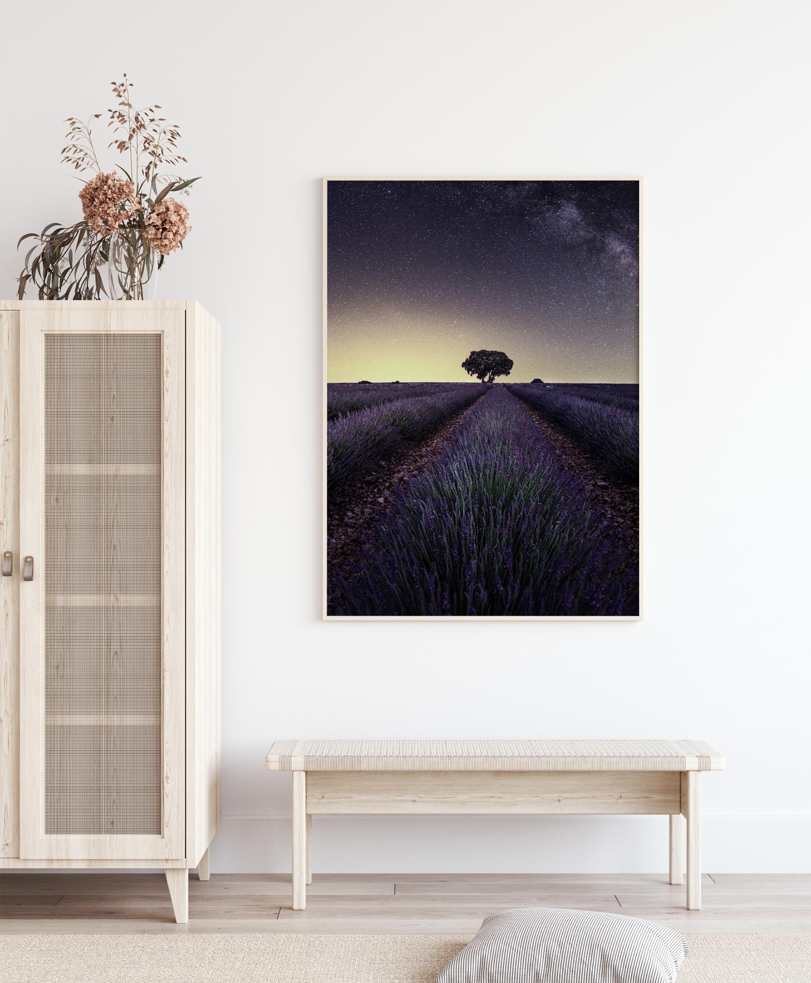 Une affiche absolument enchanteresse de champs de lavande. Les nuances intenses de la lavande violette, parfaitement alignées, dansent dans la brise du matin. Complété par un ciel étoilé sombre, un arbre solitaire est illuminé par le soleil matinal. Accrochez cette affiche dans votre cuisine pour une ambiance naturelle.