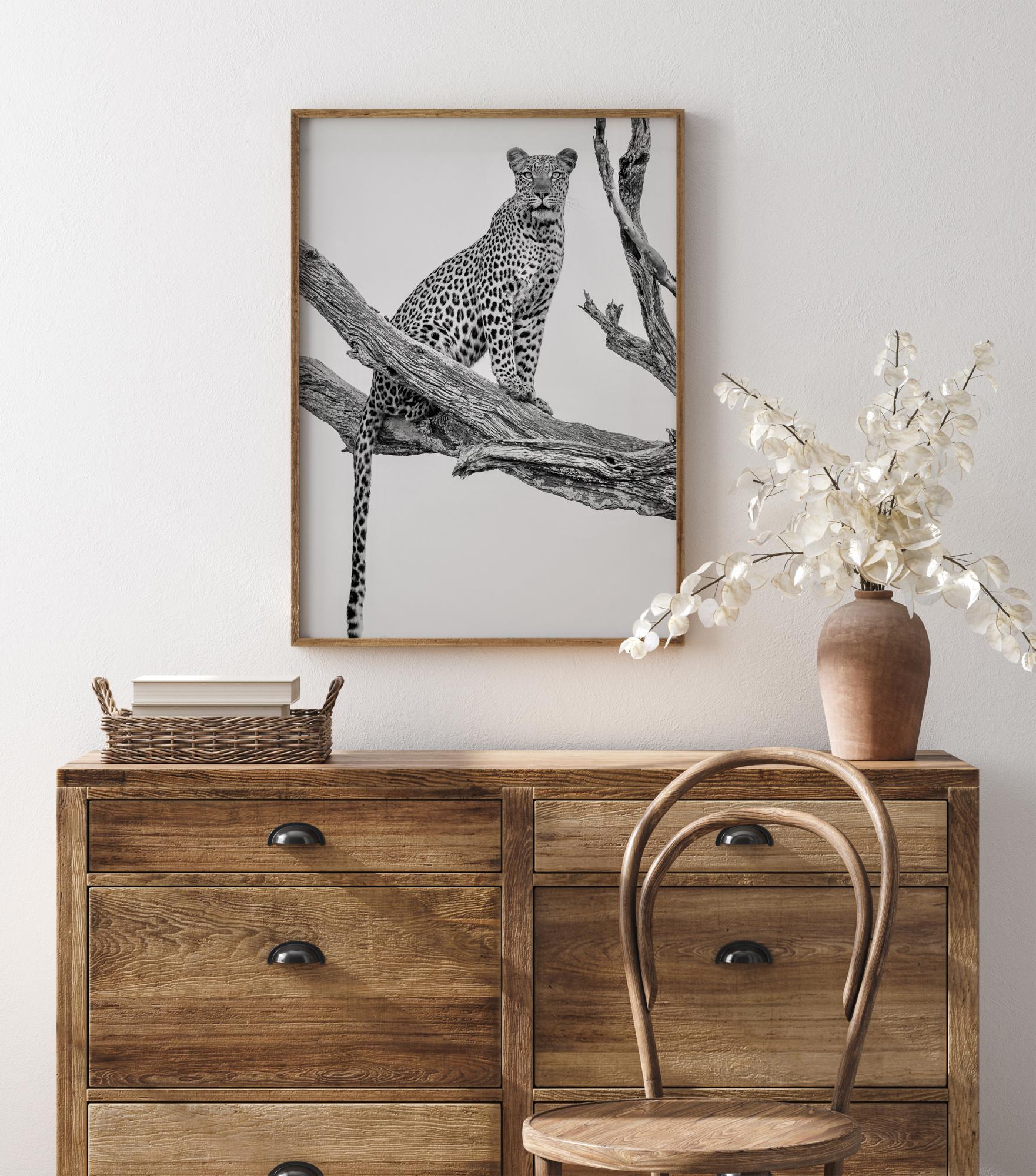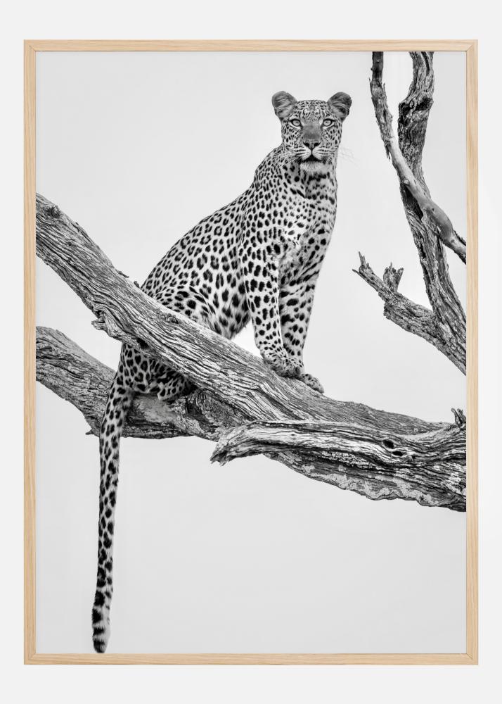 Un poster sur la nature représentant un léopard assis sur une branche d'arbre. Regardant au loin, le léopard donne un sentiment d'action imminente. Vous sentez l'anticipation dans cette affiche ?