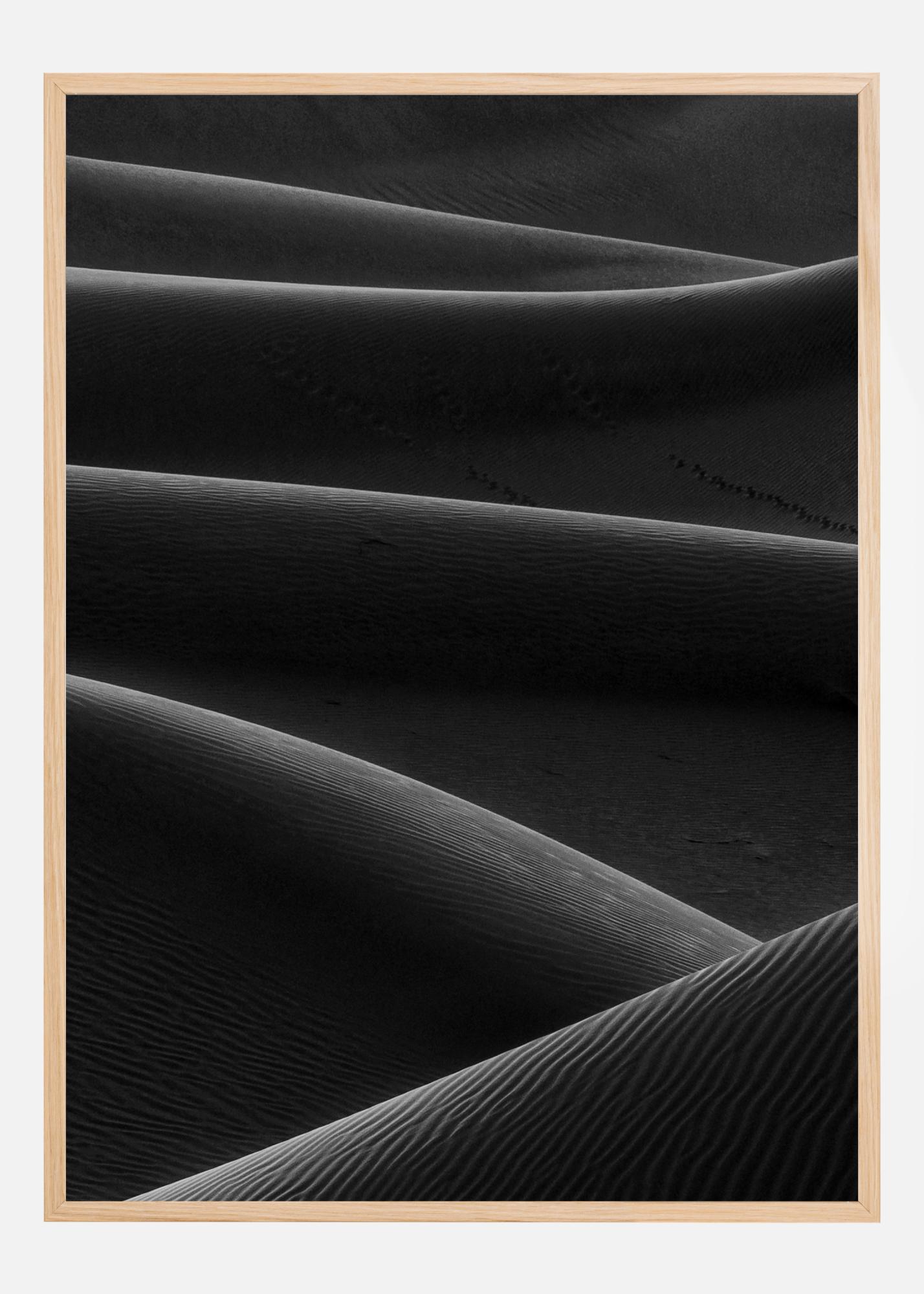 Une superbe affiche noire de dunes de sable dans le désert. Le sable ondulé est mis en valeur par la lumière naturelle qui tombe sur les dunes, créant une bordure. Une image étonnante à accrocher sur un mur blanc pour donner cette impression d'immensité.