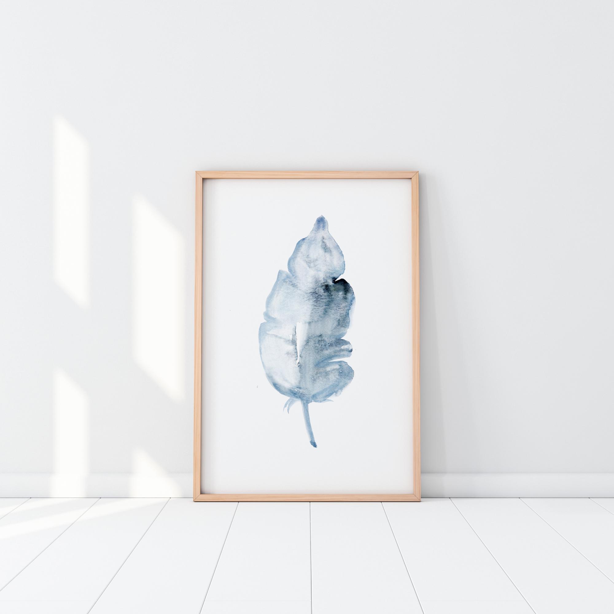Une belle affiche en gros plan d'une grande plume bleu pâle. Sur un fond blanc, la lumière se reflète sur le côté gauche de la plume, créant de la transparence. Un imprimé minimaliste qui s'intègre parfaitement à tout environnement.