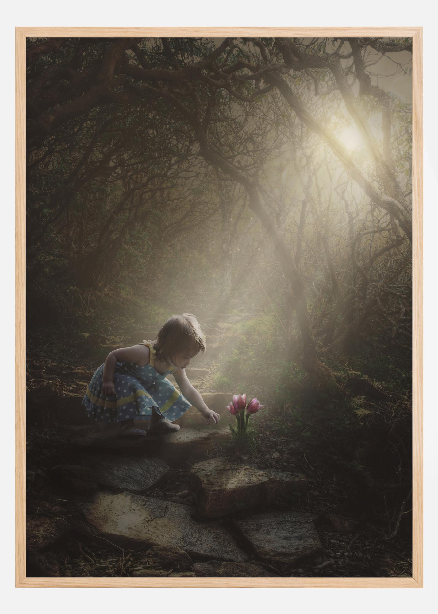Beau art graphique qui vous emmène dans un monde féerique avec sa lumière magique, sa forêt enchantée et la petite fille en aventure exploratoire. Un poster onirique qui devient de plus en plus beau à mesure qu'il grandit.