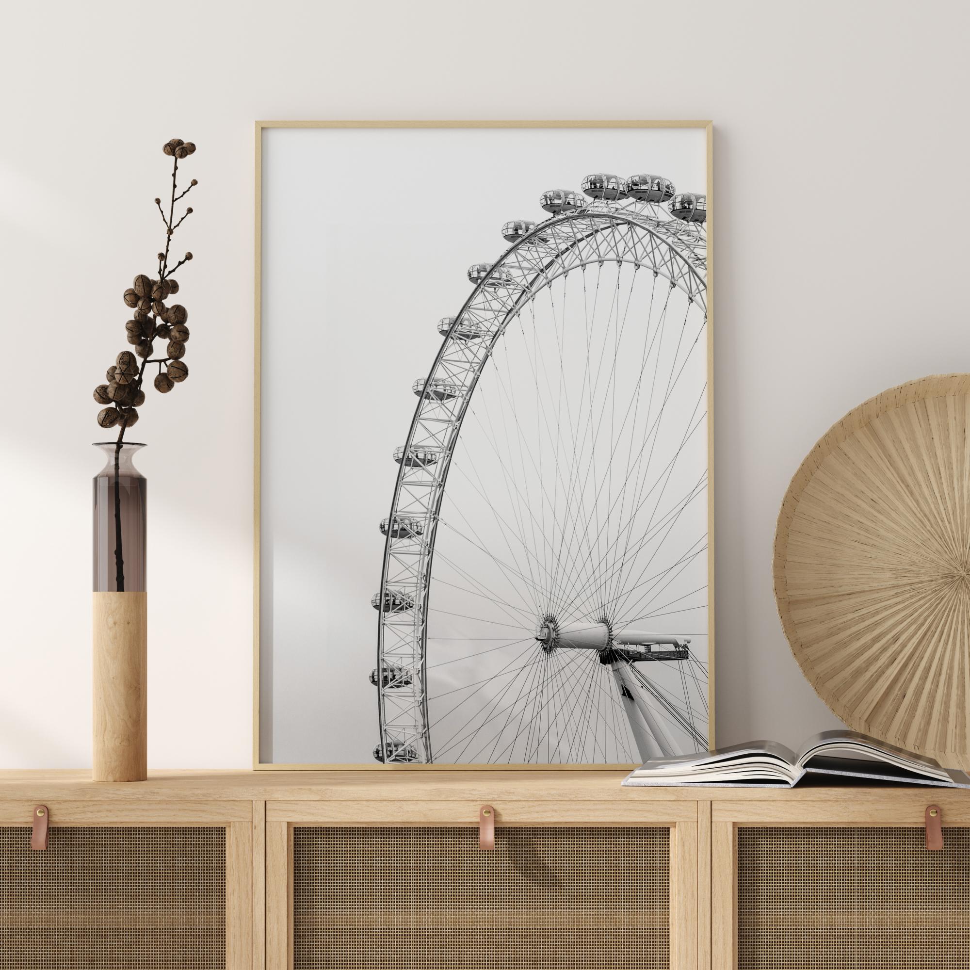 Une affiche à couper le souffle du London Eye. Avec la ligne d'horizon grise, le cadre noir du London Eye conduit votre regard vers les cabines de passagers perchées sur le bord d'une roue. Une affiche impressionnante qui souligne la taille de la roue. Un joli poster pour créer un sentiment d'immensité.