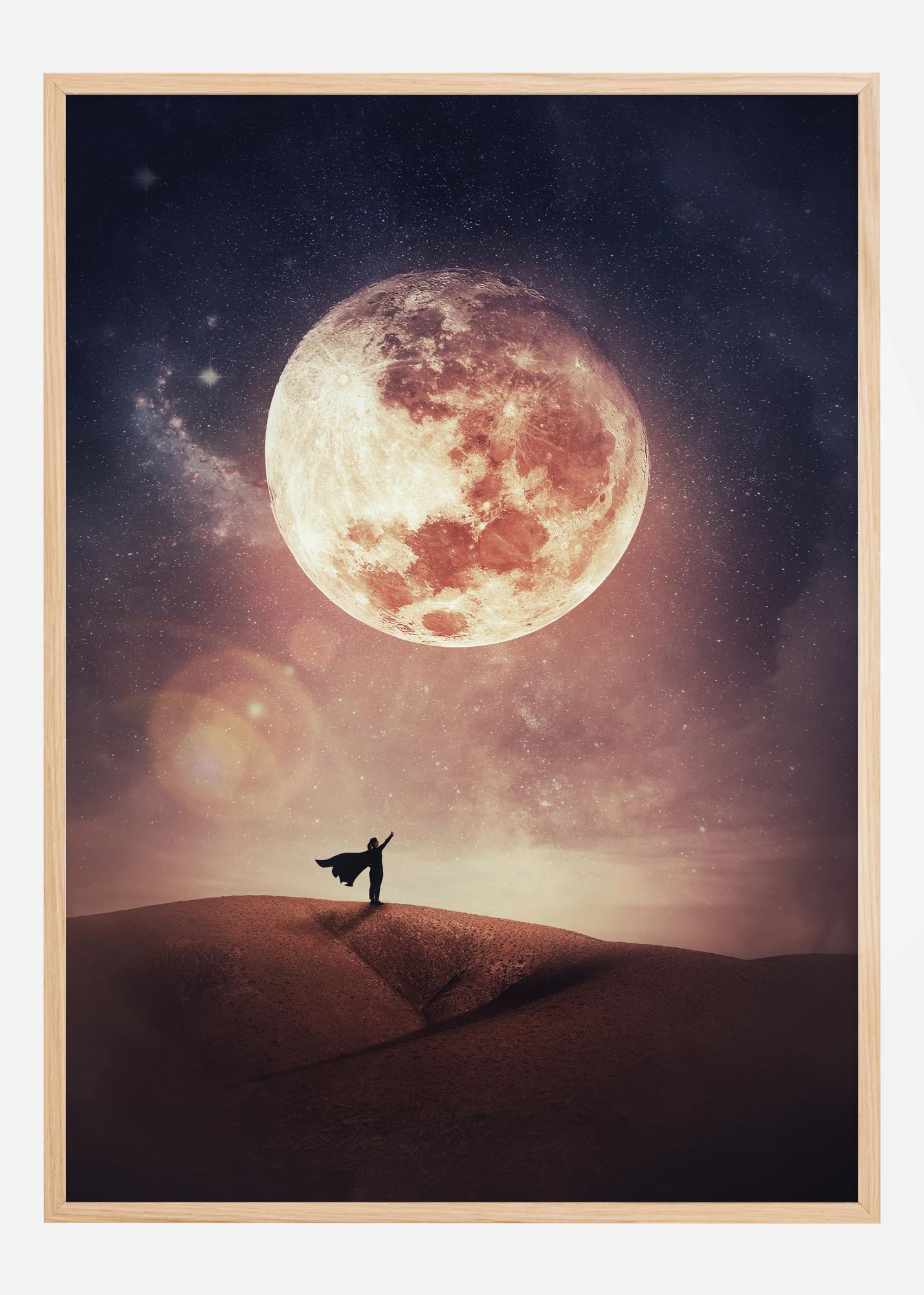 Ce poster onirique capture un moment magique où une silhouette solitaire se tient sur une colline désertique et regarde vers une immense lune rayonnante entourée d'un ciel étoilé. La scène est un puissant rappel de notre place dans l'univers, à la fois insignifiante et merveilleuse. Elle évoque des sentiments de désir et de curiosité, nous inspire à penser grand et à rêver sans limites.
