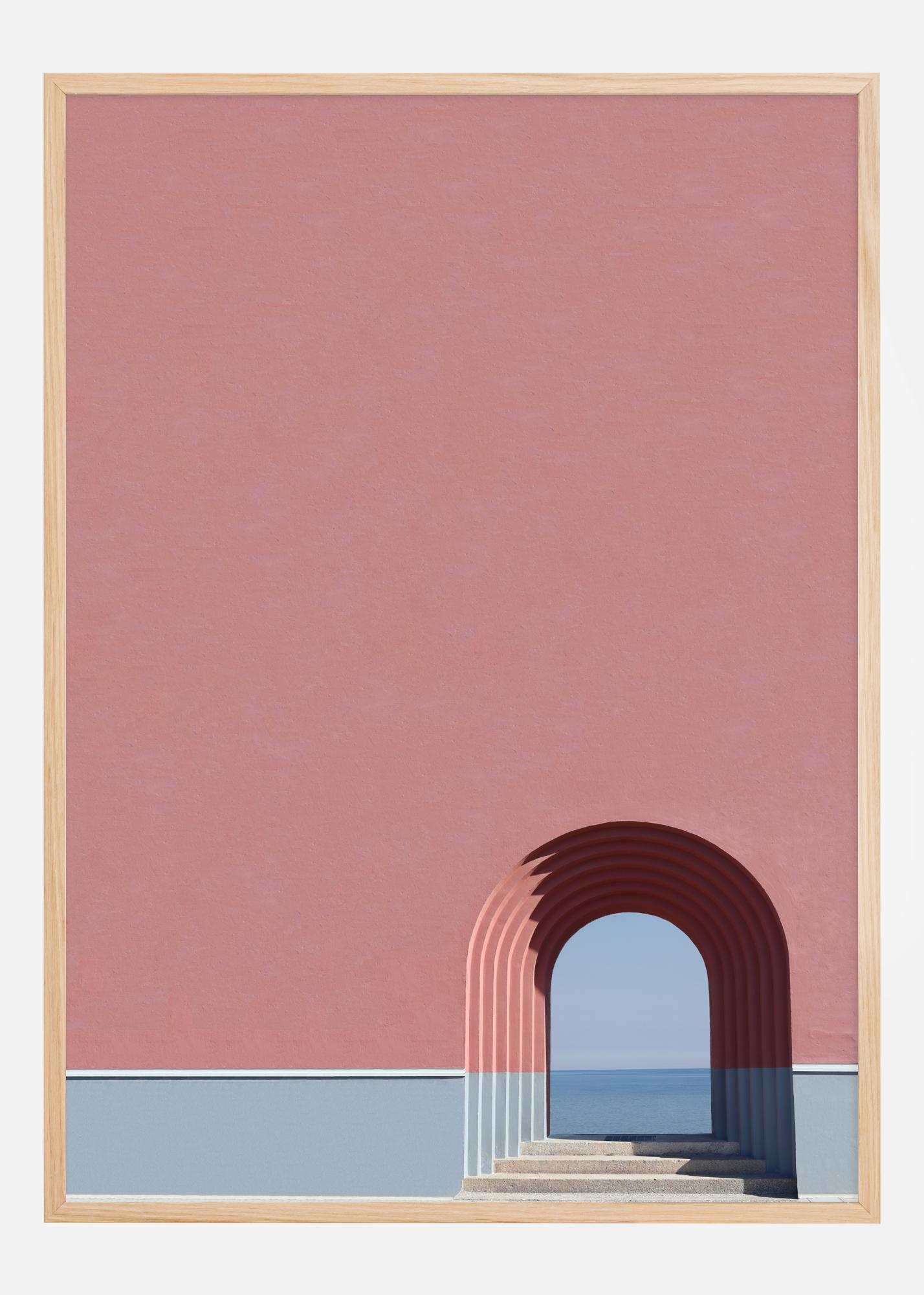 Ce poster intitulé "Regarde l'Océan" invite à la contemplation grâce à son design simple et épuré. L'image met en valeur une arche architecturale sereine qui s'ouvre sur l'horizon infini de la mer. Le motif joue avec le contraste entre la teinte rose douce du mur et la mer bleue calme, créant une sensation de tranquillité et d'harmonie.
