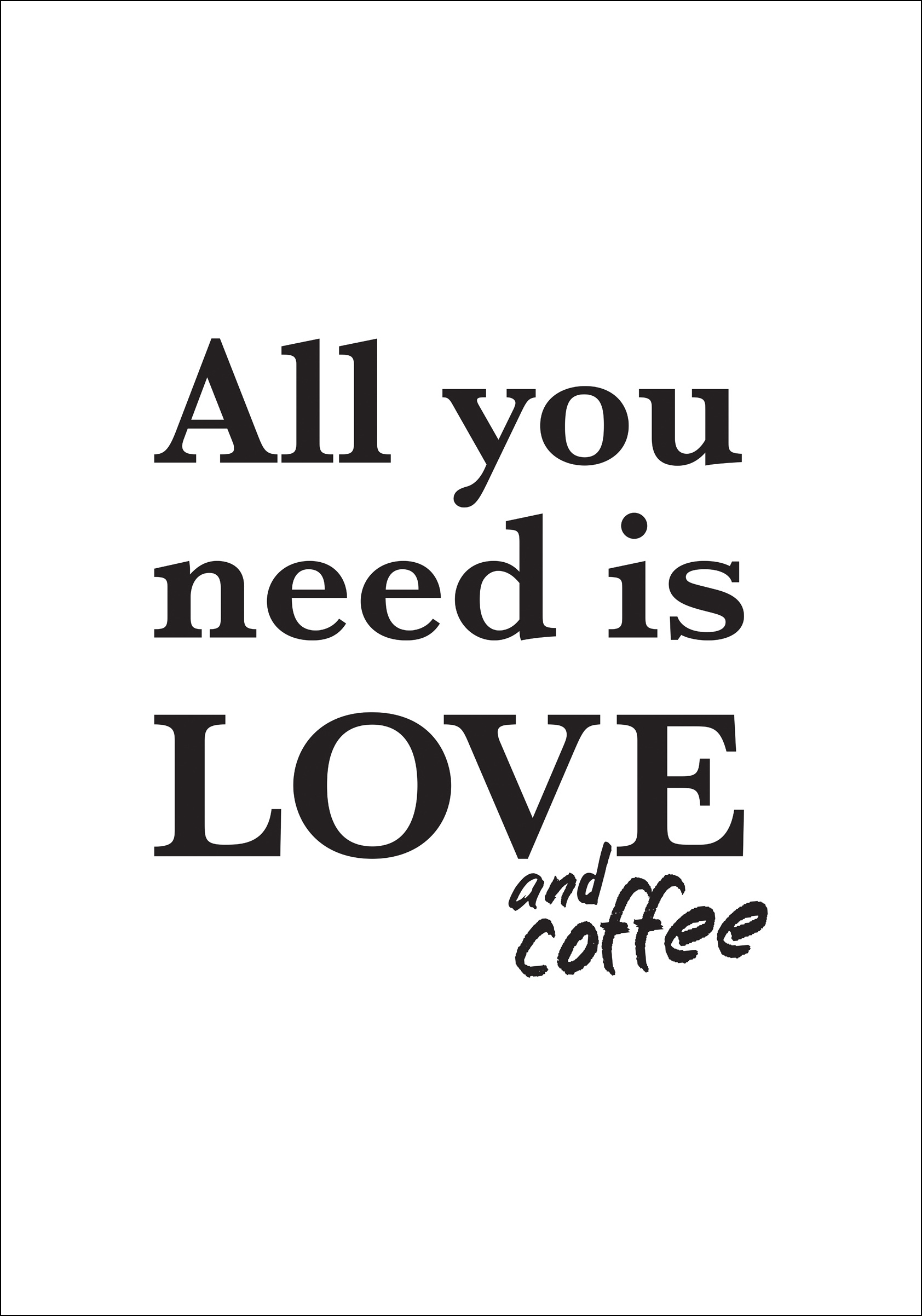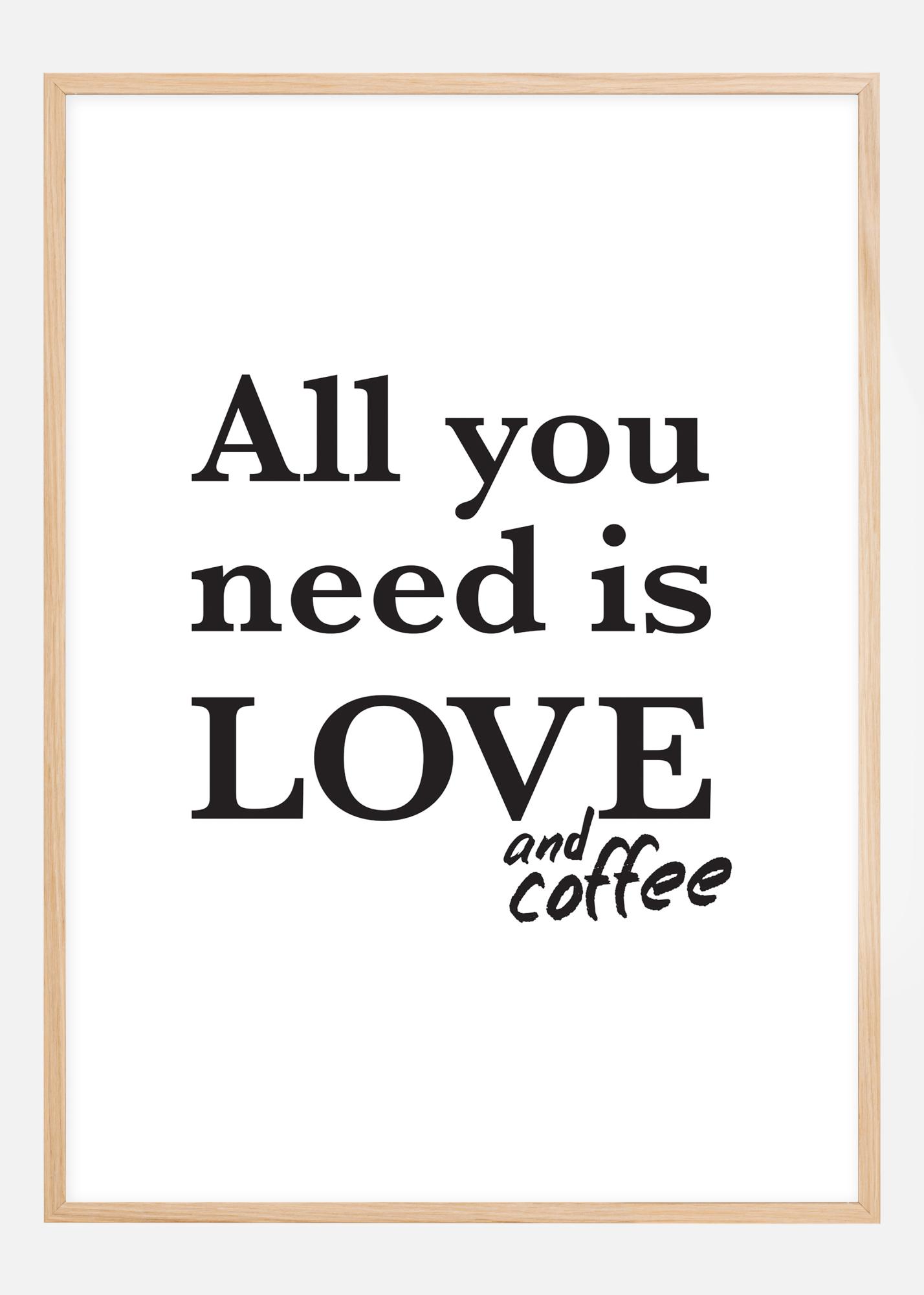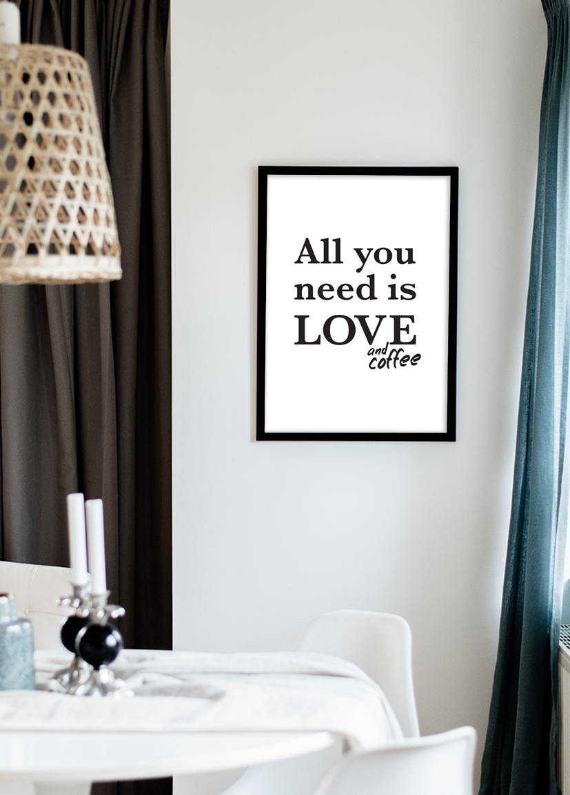 Tout ce dont vous avez besoin dans la vie, c'est d'amour. Et de café bien sûr ! Ce charmant poster deviendra un bel élément de votre décoration de cuisine à la maison ou au travail. Le poster est blanc avec une impression noire sous forme de texte "All you need is love and coffee". Vous avez l'impression que "and coffee" a été ajouté après coup. Le design noir et blanc se combine avantageusement avec un beau cadre de votre couleur préférée.
