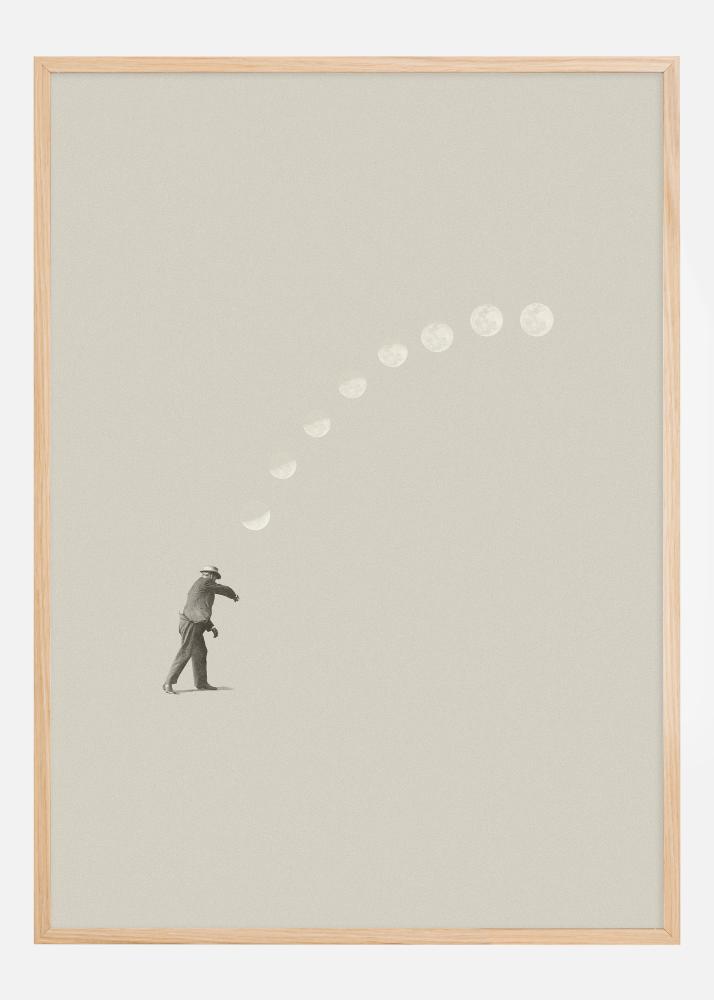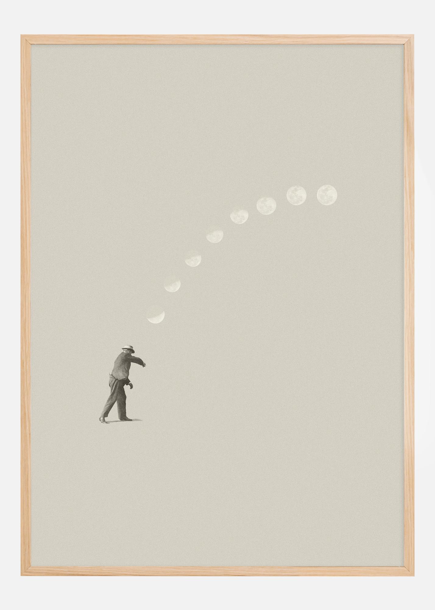 Cette affiche poétique dépeint une silhouette d'un homme qui, d'un geste puissant, lance une lune vers le ciel. C'est une scène qui capture le moment d'une lune élégamment envoyée formant une trajectoire de différentes phases lunaires. Ce geste symbolise peut-être des rêves et des ambitions propulsés vers des possibilités infinies. Le minimalisme de l'image renforce le geste puissant et laisse place à l'observateur pour qu'il remplisse sa propre histoire et signification.