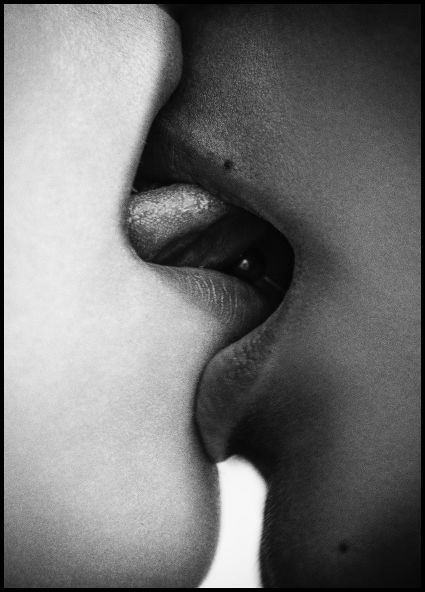Une affiche séduisante et sensuelle de deux personnes qui s'embrassent. Sur un fond blanc, un personnage noir embrasse un personnage blanc. Un beau moment intense à partager avec l'être aimé. A accrocher sur un mur de couleur neutre pour créer un sentiment d'intensité.