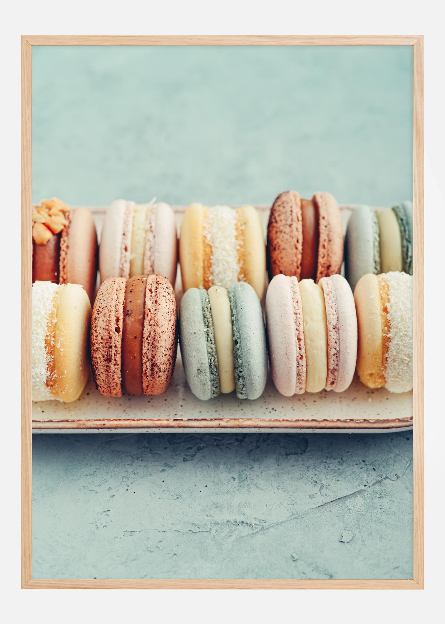 Cette affiche colorée et appétissante représente une rangée de macarons délicatement disposés, dont les couleurs et textures variées créent un festin visuel. Les douces couleurs pastel vont du citron pâle au riche caramel en passant par le rose poudré, chaque macaron est accentué de détails tels que des vermicelles et des copeaux de noix de coco, ce qui rehausse son aspect et sa saveur supposée.