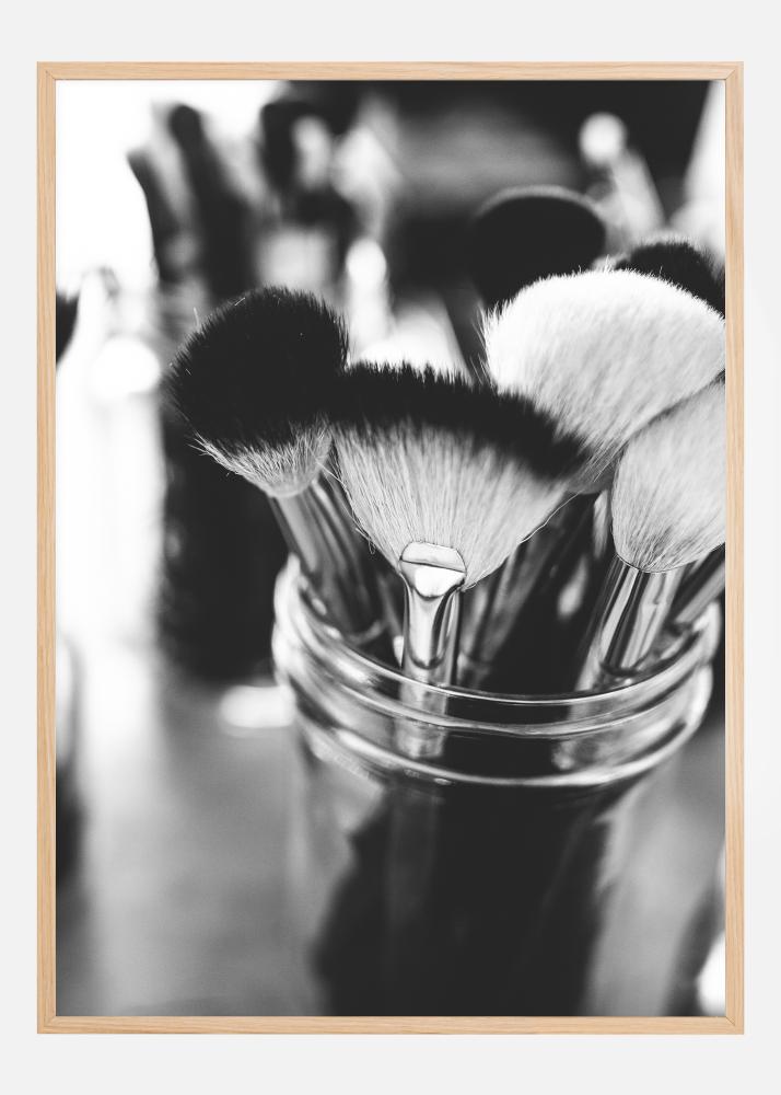 Une affiche artistique et amusante représentant un bocal en verre rempli de pinceaux de maquillage. Cette image saisissante en noir et blanc montre une variété de tailles de pinceaux. Sentez la douceur de ces brosses en accrochant cette impression sur le mur de votre chambre.