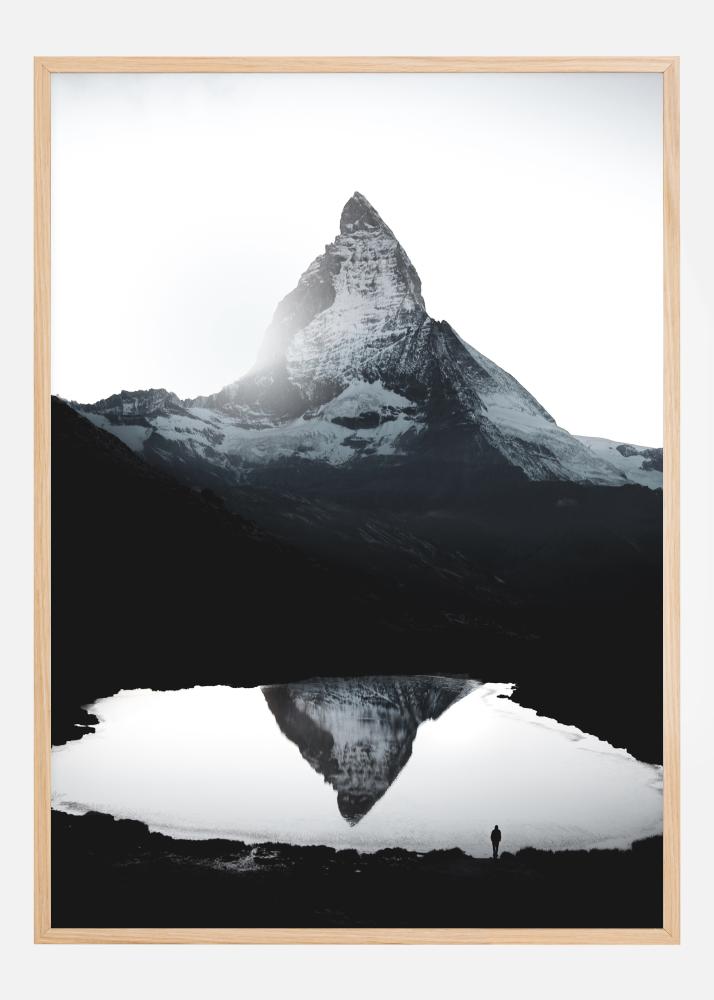 Cette superbe affiche en noir et blanc montre le pic du Cervin perçant le ciel du matin. Les rayons du soleil éclipsent la pente déchiquetée de la montagne tandis qu'un homme regarde fixement. Le reflet de la scène est capturé dans le lac au fond de la scène. Entendez le silence en accrochant ce tirage dans votre salon.