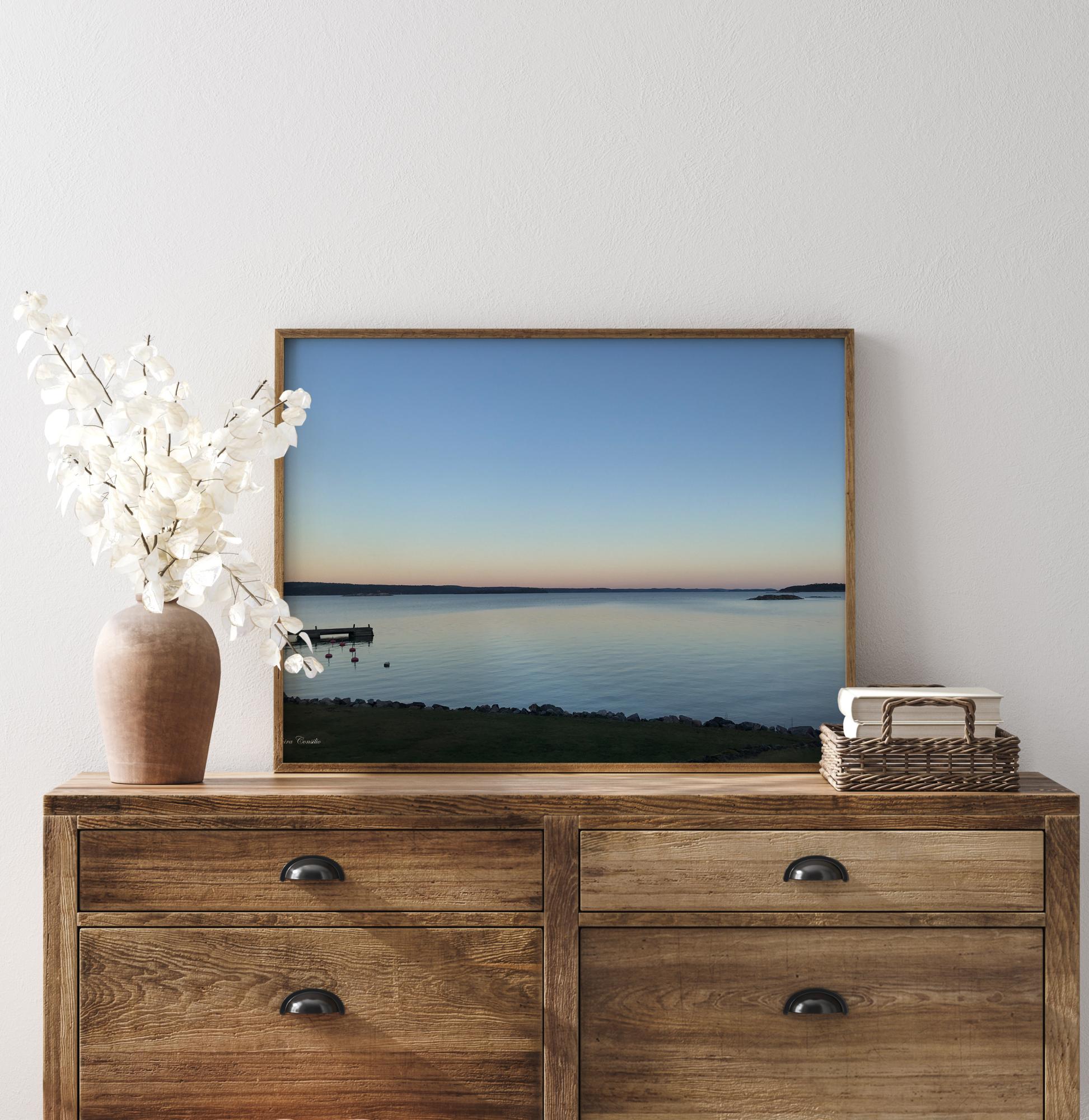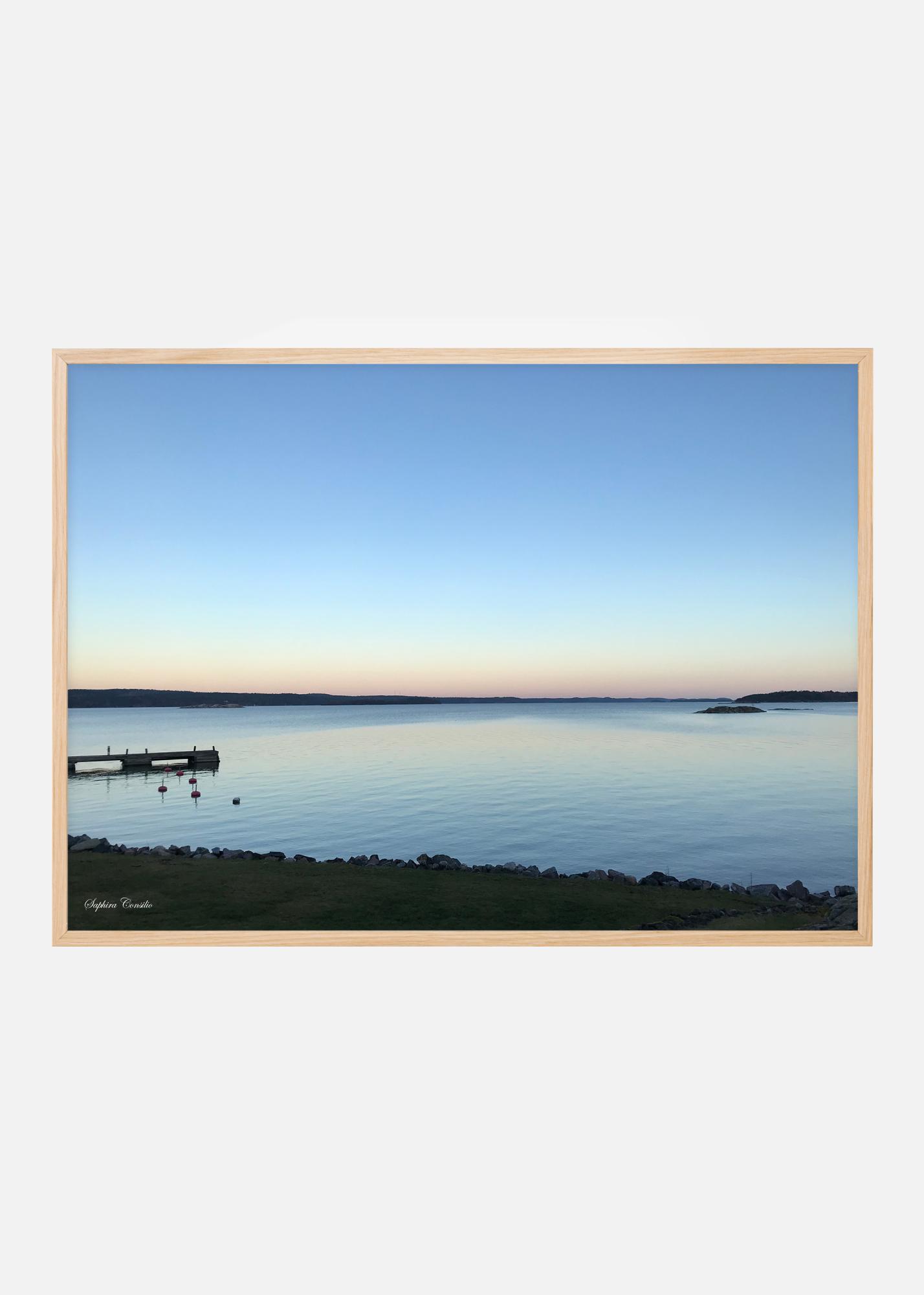 Un poster photographique de l'archipel suédois avec ses îles et rochers dans un magnifique coucher de soleil. Un ponton avec ses bouées adjacentes ajoute un peu de vie à l'image. Un poster merveilleusement apaisant créé par le photographe Saphira Consilio.