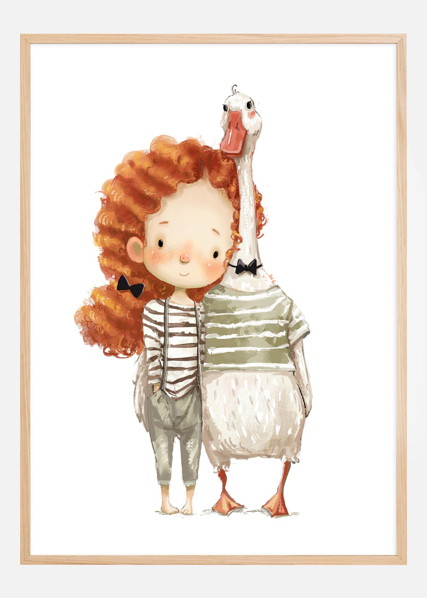 Cette affiche ludique et réconfortante dépeint une jeune fille aux boucles rouges et vibrantes, se tenant aux côtés de son fidèle compagnon, un grand canard. Ils partagent un moment tendre et joyeux ensemble, capturé dans les tons doux et chauds de l'aquarelle. Le charmant duo, avec les joues roses de la fillette et le regard curieux du canard, dégage amitié et joie.