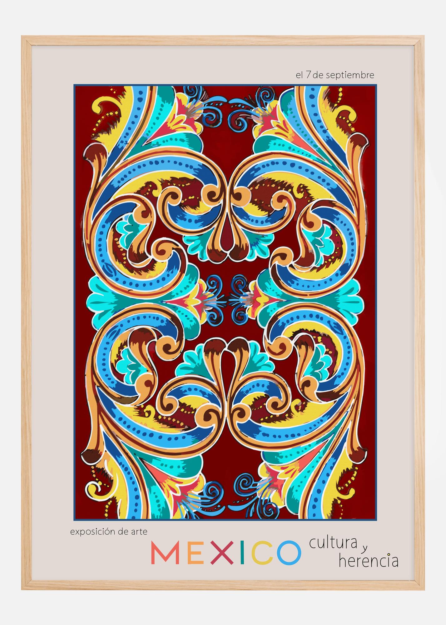 Cette affiche vive et colorée célèbre une exposition d'art au Mexique. Son design est inspiré par des motifs mexicains traditionnels, remplis de courbes ondulantes et de motifs floraux exubérants qui invitent l'œil à danser sur l'image. Les riches couleurs rouges, jaunes et bleues sont typiques de l'art populaire mexicain et symbolisent la culture et l'héritage de la nation avec une touche moderne.