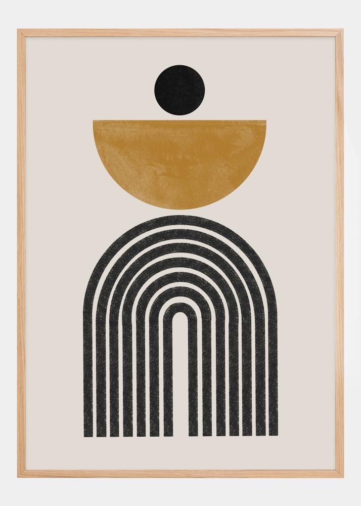 Plongez-vous dans un monde d'abstraction et de symétrie avec notre affiche moderne représentant une série d'arcs en noir et blanc sous un demi-cercle doré en forme de soleil, surmonté d'un cercle noir. Cette impression est un hymne à la clarté de l'art moderne et à la simplicité du design géométrique, apportant une touche sophistiquée à votre intérieur. Les couleurs sont audacieusement réduites pour souligner le contraste et le poids visuel de chaque forme.