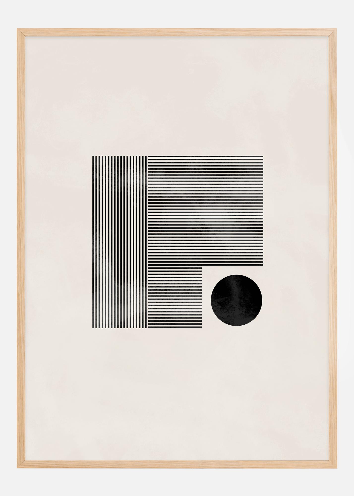 Ce poster élégant et minimaliste présente un jeu géométrique entre des rectangles et un cercle, tous représentés en lignes et formes noires audacieuses sur un fond doux de couleur crème. La composition stricte des lignes dans les rectangles donne une impression d'ordre et de structure, tandis que le cercle noir solitaire rompt cette harmonie et introduit une irrégularité qui crée un intérêt visuel et un équilibre. C'est une œuvre d'art qui peut être appréciée pour sa simplicité et sa capacité à compléter une multitude de styles d'intérieur.