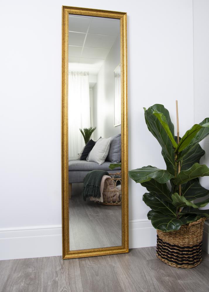Élégant miroir doré profilé au traitement à l'ancienne qui donne plus de vie au cadre. Ce miroirs'intègre parfaitement aussi bien dans un intérieur avec des meubles de style que dans un dressing glamour, où il ne prend pas beaucoup de place mais montre toutefois l'ensemble du corps. À combiner avec des accessoires d'intérieur en laiton ou de couleur dorée pour créer un intérieur assorti et mettre en valeur le miroir.