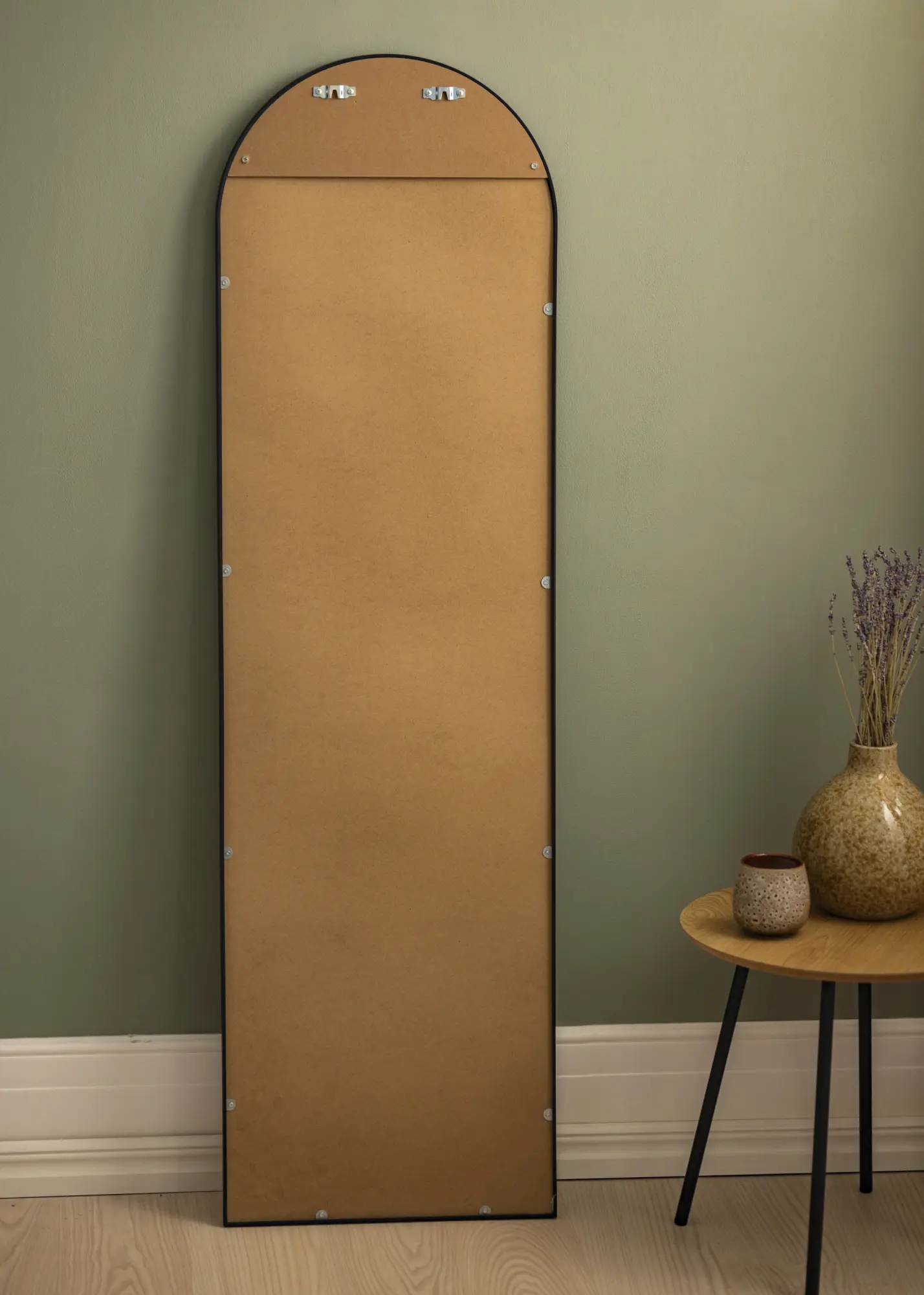Ce miroir intemporel deviendra un élément élégant dans votre maison, que vous ayez un intérieur moderne ou traditionnel. Le miroir mural possède une forme élégante en arc et un cadre mince en aluminium noir. Il est monté sur le mur en position verticale.