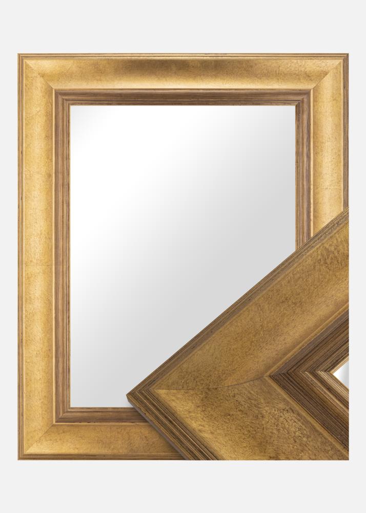 Le cadre est fabriqué en pin et possède une belle teinte or foncé qui évoque un sentiment de luxe et d'élégance. La surface brossée présente des variations subtiles qui créent une sensation légèrement patinée, conférant au miroir un charme intemporel. Les fines lignes le long des bords ajoutent une richesse de détails sophistiqués qui font ressortir le miroir.