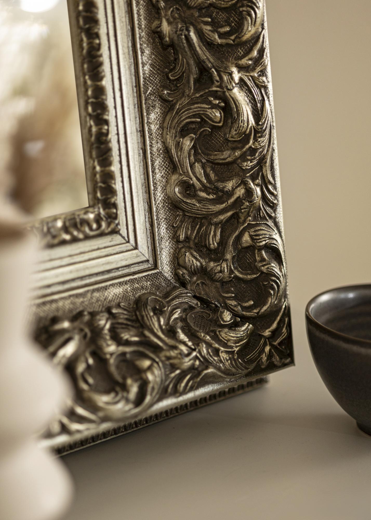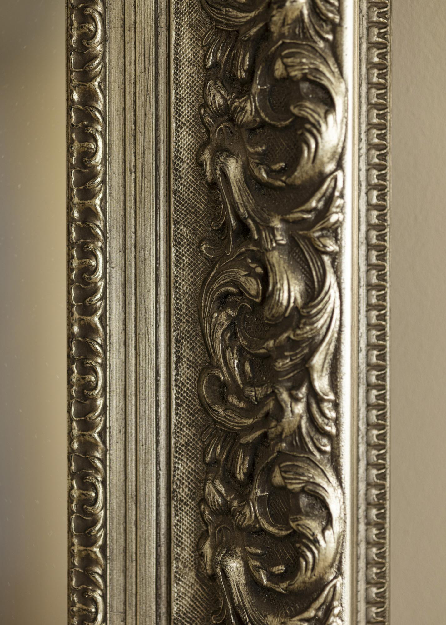 Le miroir Birmingham Argent est un miroir personnalisé fabriqué par nos soins, vous offrant la possibilité de l'obtenir exactement dans les dimensions que vous souhaitez. Avec sa moulure de cadre impressionnante de 152 mm de large et une profondeur de 74 mm, ce miroir devient un élément accrocheur dans n'importe quelle pièce où il est placé. Le cadre est fabriqué en pin et présente un design orné d'argent antique, ce qui confère au miroir un caractère unique.